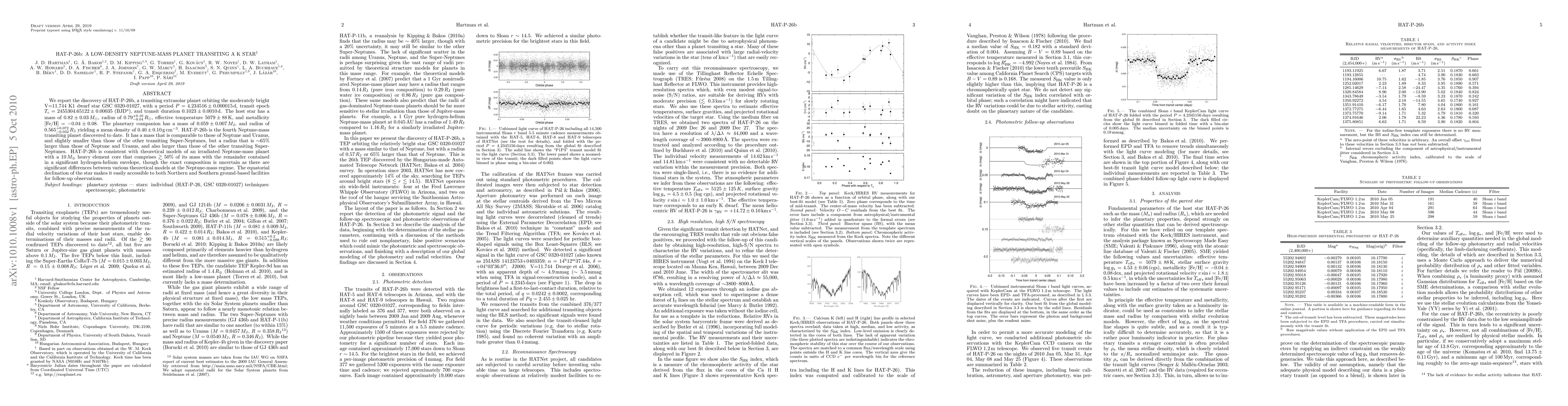 HAT-P-26b is a low-density Neptune-mass planet transiting a K1 dwarf star, with a radius ~65% larger than Neptune's, suggesting a significant hydrogen-helium envelope. It is the fourth transiting Neptune-mass planet discovered, providing insights into planetary formation and composition models.