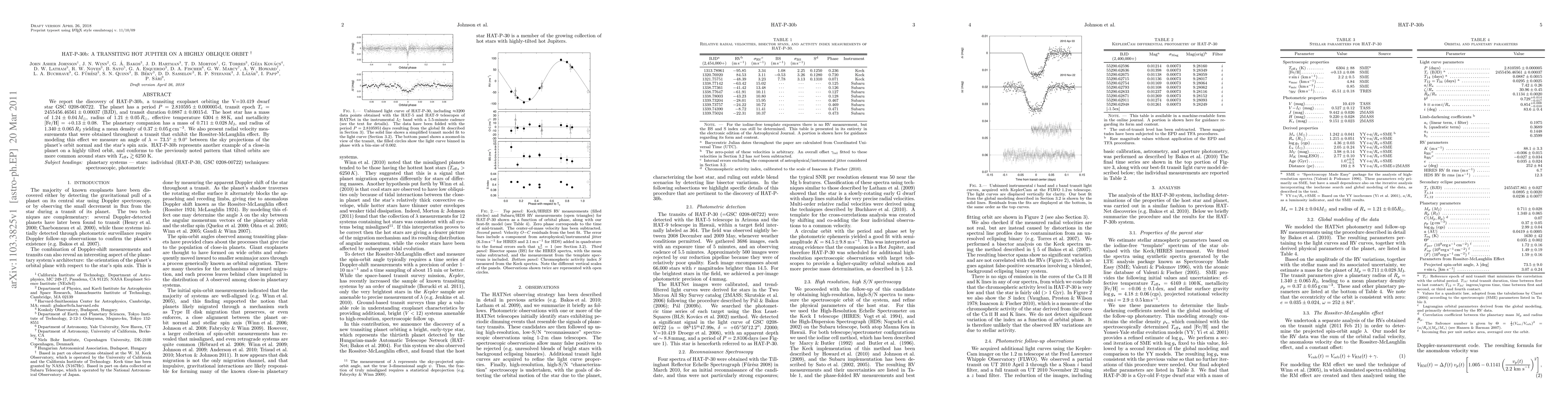 We report the discovery of HAT-P-30b, a transiting exoplanet orbiting the V=10.419 dwarf star GSC 0208-00722. The planet has a period P=2.810595+/-0.000005 d, transit epoch Tc = 2455456.46561+/-0.00037 (BJD), and transit duration 0.0887+/-0.0015 d. The host star has a mass of 1.24+/-0.04 Msun, radius of 1.21+/-0.05 Rsun, effective temperature 6304+/-88 K, and metallicity [Fe/H] = +0.13+/-0.08. The planetary companion has a mass of 0.711+/-0.028 Mjup, and radius of 1.340+/-0.065 Rjup yielding a mean density of 0.37+/-0.05 g cm^-3. We also present radial velocity measurements that were obtained throughout a transit that exhibit the Rossiter-McLaughlin effect. By modeling this effect we measure an angle of \lambda = 73.5+/-9.0 deg between the sky projections of the planet's orbit normal and the star's spin axis. HAT-P-30b represents another example of a close-in planet on a highly tilted orbit, and conforms to the previously noted pattern that tilted orbits are more common around stars with Teff > 6250 K.