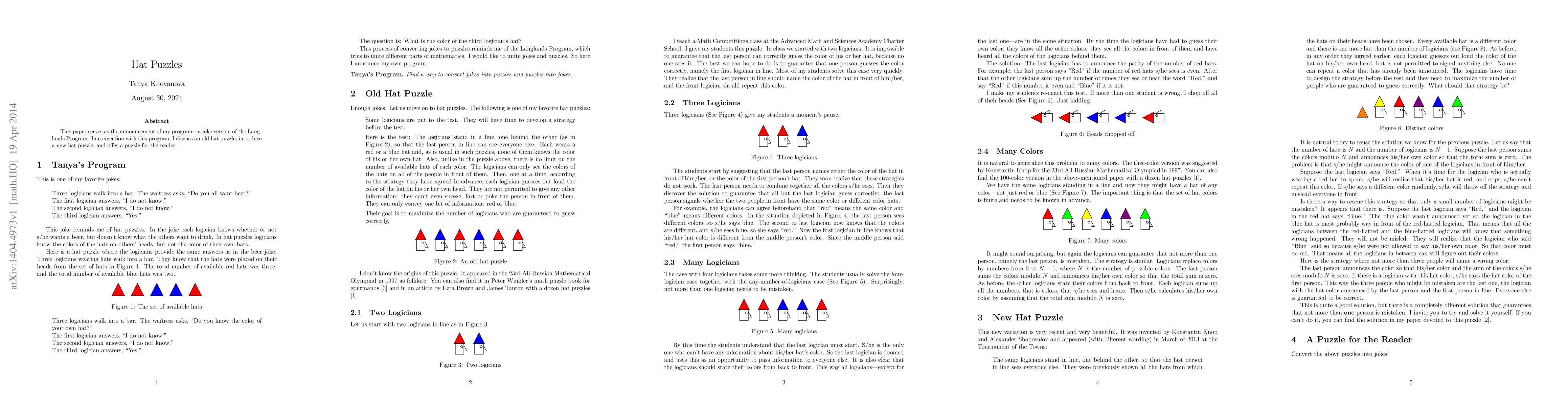 This paper presents a humorous take on the Langlands Program by introducing new hat puzzles, one of which is proposed for the reader's solution, with no clear key findings or methodology presented.