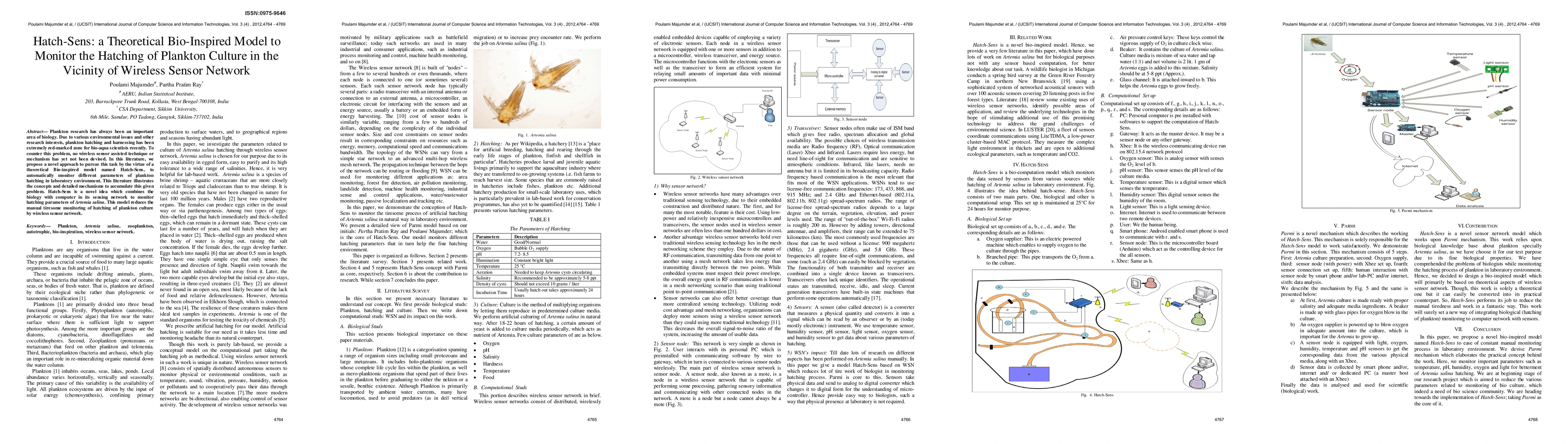 Plankton research has always been an important area of biology. Due to various environmental issues and other research interests, plankton hatching and harnessing has been extremely red-marked zone for bio-aqua scientists recently. To counter this problem, no wireless sensor assisted technique or mechanism has yet not been devised. In this literature, we propose a novel approach to pursue this task by the virtue of a theoretical Bio-inspired model named Hatch-Sens, to automatically monitor different parameters of plankton hatching in laboratory environment. This literature illustrates the concepts and detailed mechanisms to accumulate this given problem. Hatch-Sens is a novel idea which combines the biology with computer in its sensing network to monitor hatching parameters of Artemia salina. This model reduces the manual tiresome monitoring of hatching of plankton culture by wireless sensor network.