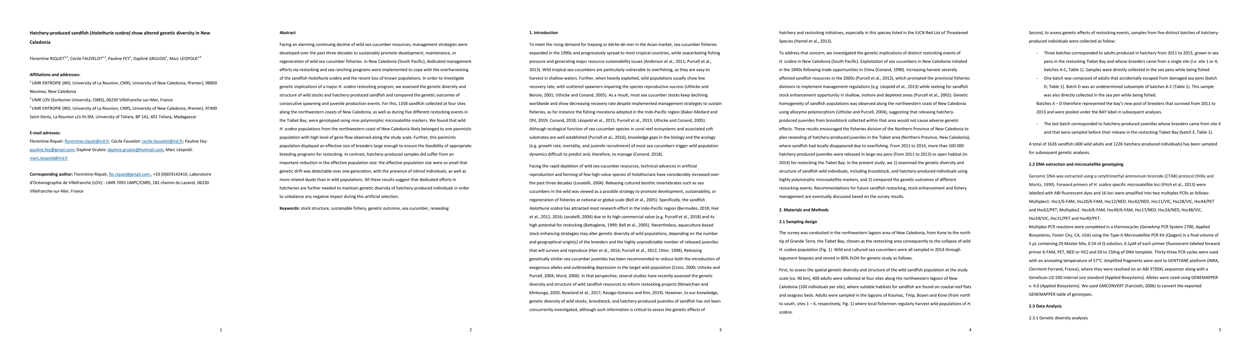 This study investigates the genetic diversity of wild and hatchery-produced sandfish (Holothuria scabra) in New Caledonia, revealing high genetic diversity in wild populations but significant reductions in hatchery-produced samples due to genetic drift and inbreeding. Efforts to maintain genetic diversity in hatcheries are recommended to support sustainable restocking programs.