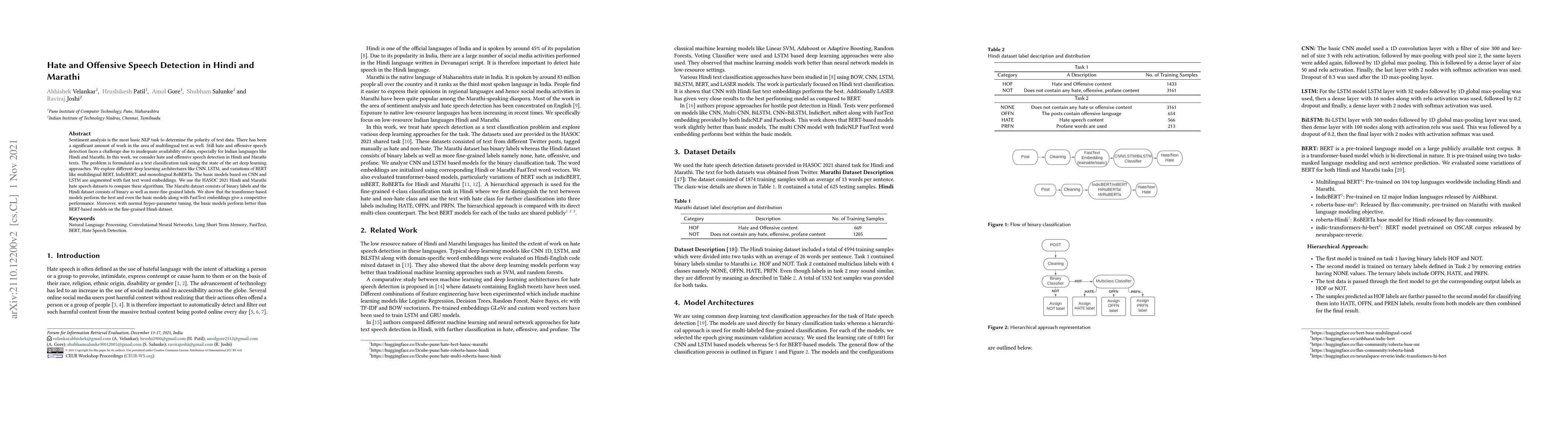 This paper investigates the detection of hate and offensive speech in Hindi and Marathi using state-of-the-art deep learning models like CNN, LSTM, and BERT variants. The results show that transformer-based models outperform others, while basic models with FastText embeddings also provide competitive results, especially with hyperparameter tuning on the fine-grained Hindi dataset.