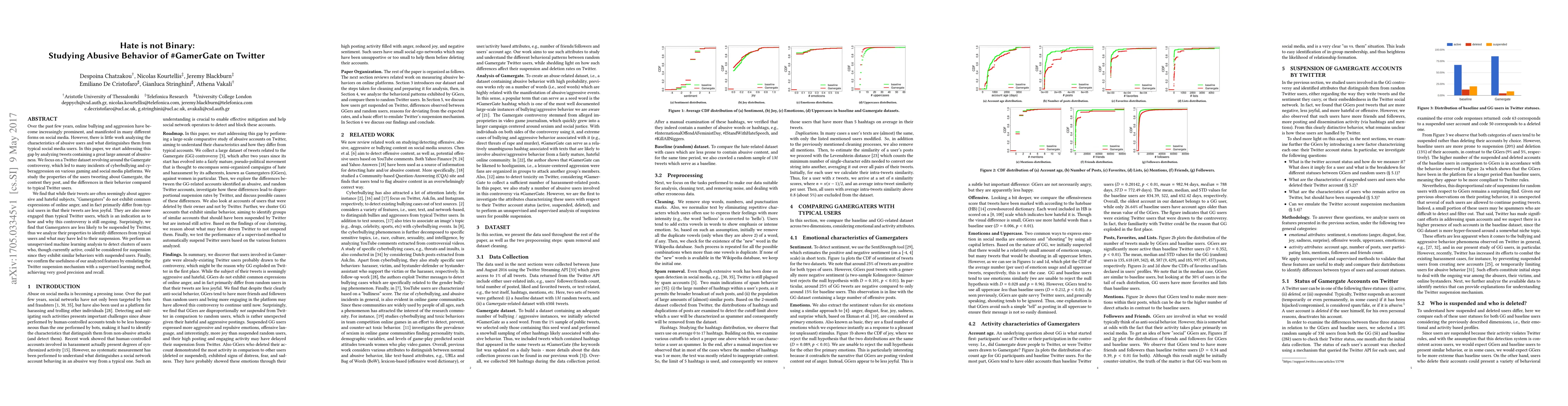 Over the past few years, online bullying and aggression have become increasingly prominent, and manifested in many different forms on social media. However, there is little work analyzing the characteristics of abusive users and what distinguishes them from typical social media users. In this paper, we start addressing this gap by analyzing tweets containing a great large amount of abusiveness. We focus on a Twitter dataset revolving around the Gamergate controversy, which led to many incidents of cyberbullying and cyberaggression on various gaming and social media platforms. We study the properties of the users tweeting about Gamergate, the content they post, and the differences in their behavior compared to typical Twitter users. We find that while their tweets are often seemingly about aggressive and hateful subjects, "Gamergaters" do not exhibit common expressions of online anger, and in fact primarily differ from typical users in that their tweets are less joyful. They are also more engaged than typical Twitter users, which is an indication as to how and why this controversy is still ongoing. Surprisingly, we find that Gamergaters are less likely to be suspended by Twitter, thus we analyze their properties to identify differences from typical users and what may have led to their suspension. We perform an unsupervised machine learning analysis to detect clusters of users who, though currently active, could be considered for suspension since they exhibit similar behaviors with suspended users. Finally, we confirm the usefulness of our analyzed features by emulating the Twitter suspension mechanism with a supervised learning method, achieving very good precision and recall.