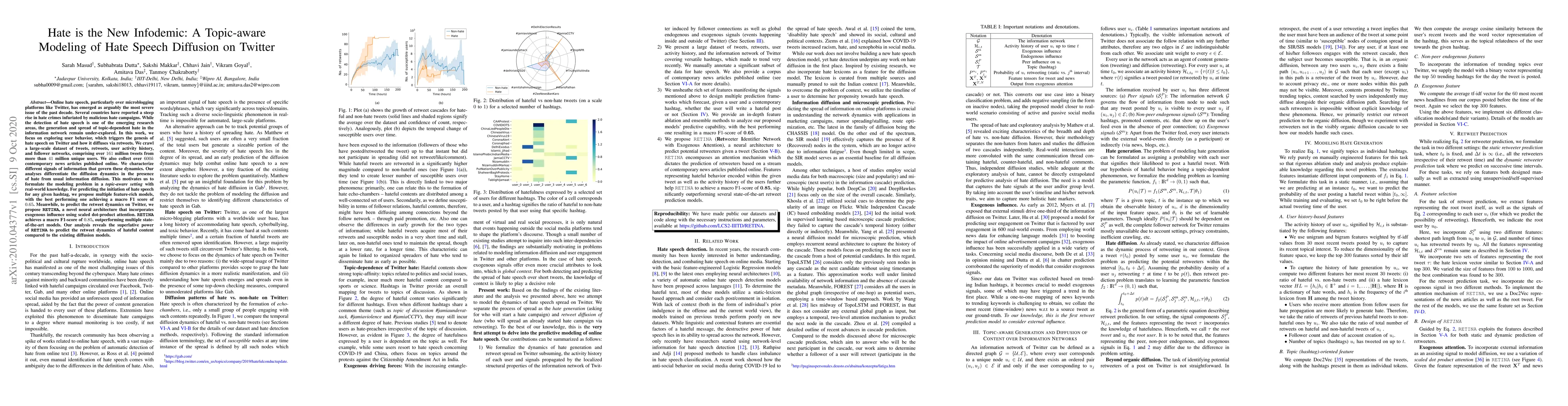 This paper investigates the spread of hate speech on Twitter, focusing on how it originates and diffuses through retweets. It proposes a topic-aware model to predict the initiation of hate speech and introduces RETINA, a neural architecture for predicting retweet dynamics, achieving superior performance with a macro F1-score of 0.85. The study highlights the unique diffusion patterns of hate speech compared to regular information.