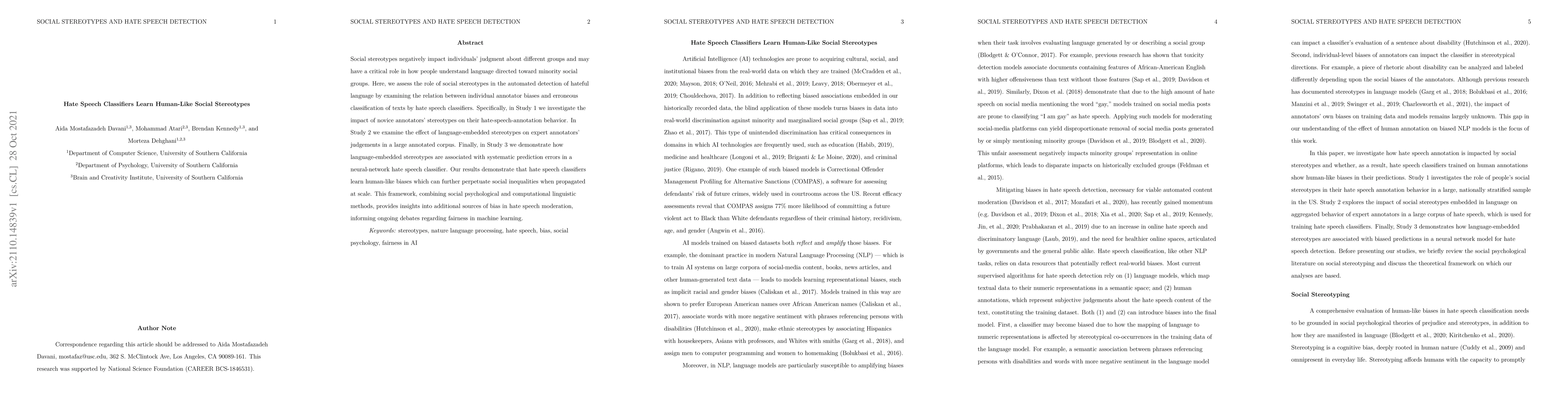 Social stereotypes negatively impact individuals' judgements about different groups and may have a critical role in how people understand language directed toward minority social groups. Here, we assess the role of social stereotypes in the automated detection of hateful language by examining the relation between individual annotator biases and erroneous classification of texts by hate speech classifiers. Specifically, in Study 1 we investigate the impact of novice annotators' stereotypes on their hate-speech-annotation behavior. In Study 2 we examine the effect of language-embedded stereotypes on expert annotators' aggregated judgements in a large annotated corpus. Finally, in Study 3 we demonstrate how language-embedded stereotypes are associated with systematic prediction errors in a neural-network hate speech classifier. Our results demonstrate that hate speech classifiers learn human-like biases which can further perpetuate social inequalities when propagated at scale. This framework, combining social psychological and computational linguistic methods, provides insights into additional sources of bias in hate speech moderation, informing ongoing debates regarding fairness in machine learning.