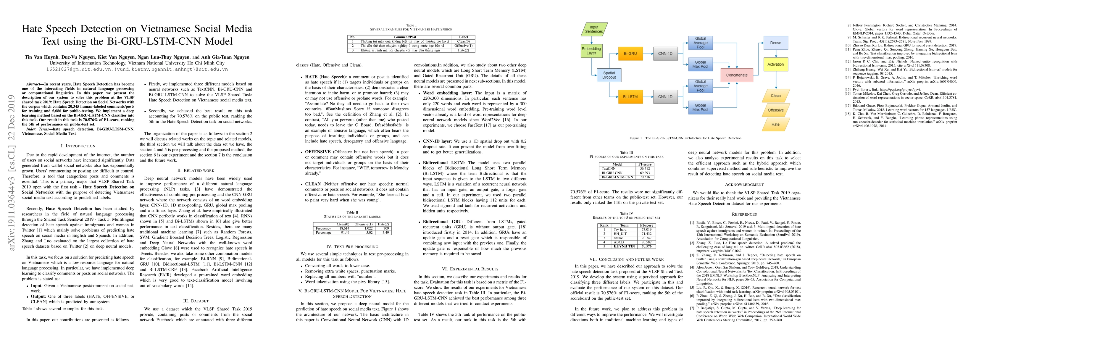 This research paper introduces a deep learning model, Bi-GRU-LSTM-CNN, for detecting hate speech in Vietnamese social media text. The study participated in the VLSP shared task 2019, achieving a 70.576% F1-score, ranking 5th in the public-testing set, using a dataset of 20,345 training and 5,086 testing comments/posts. For more details, please refer to the original paper.