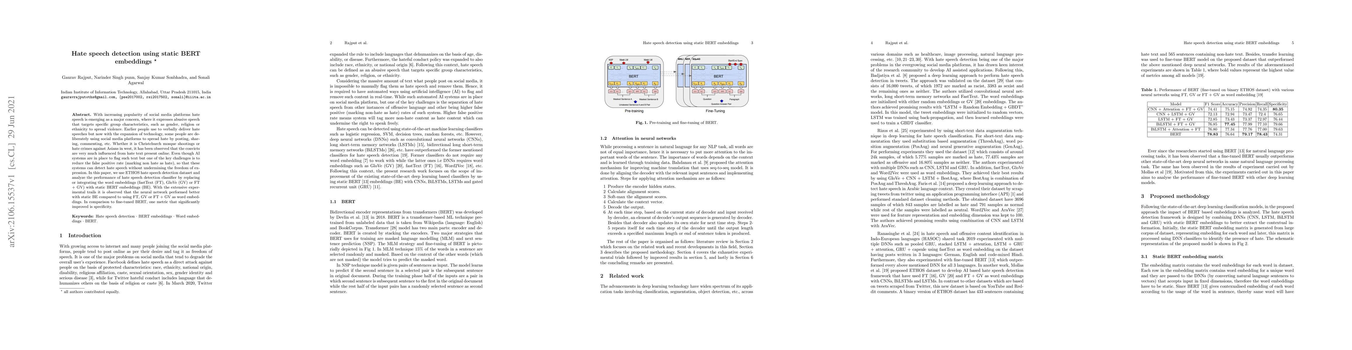 With increasing popularity of social media platforms hate speech is emerging as a major concern, where it expresses abusive speech that targets specific group characteristics, such as gender, religion or ethnicity to spread violence. Earlier people use to verbally deliver hate speeches but now with the expansion of technology, some people are deliberately using social media platforms to spread hate by posting, sharing, commenting, etc. Whether it is Christchurch mosque shootings or hate crimes against Asians in west, it has been observed that the convicts are very much influenced from hate text present online. Even though AI systems are in place to flag such text but one of the key challenges is to reduce the false positive rate (marking non hate as hate), so that these systems can detect hate speech without undermining the freedom of expression. In this paper, we use ETHOS hate speech detection dataset and analyze the performance of hate speech detection classifier by replacing or integrating the word embeddings (fastText (FT), GloVe (GV) or FT + GV) with static BERT embeddings (BE). With the extensive experimental trails it is observed that the neural network performed better with static BE compared to using FT, GV or FT + GV as word embeddings. In comparison to fine-tuned BERT, one metric that significantly improved is specificity.