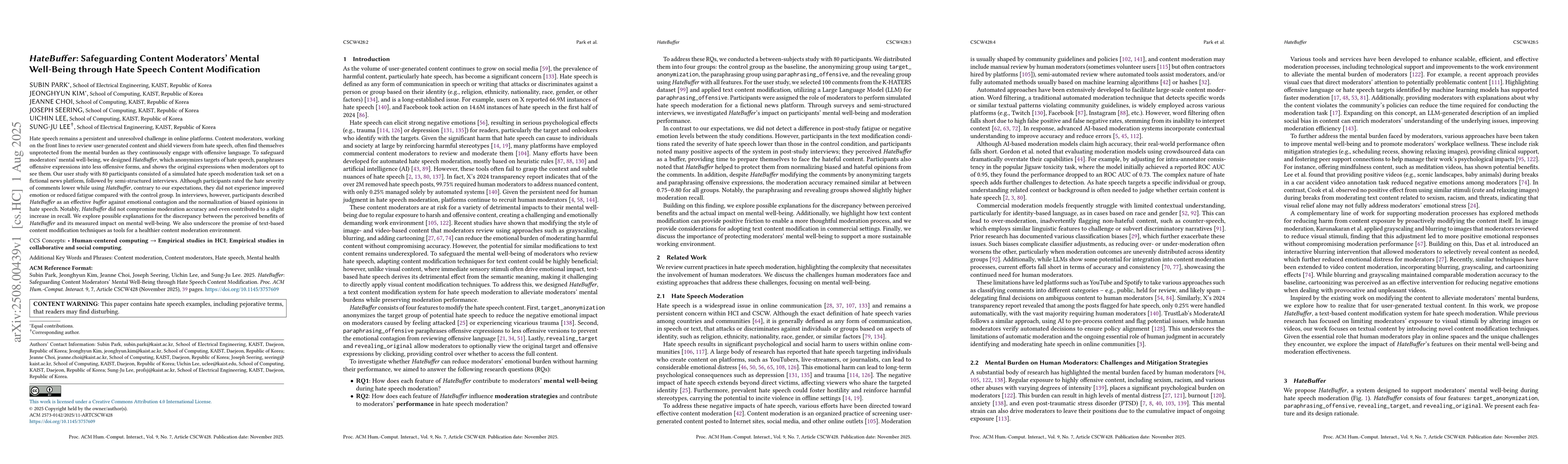 Hate speech remains a persistent and unresolved challenge in online platforms. Content moderators, working on the front lines to review user-generated content and shield viewers from hate speech, often find themselves unprotected from the mental burden as they continuously engage with offensive language. To safeguard moderators' mental well-being, we designed HateBuffer, which anonymizes targets of hate speech, paraphrases offensive expressions into less offensive forms, and shows the original expressions when moderators opt to see them. Our user study with 80 participants consisted of a simulated hate speech moderation task set on a fictional news platform, followed by semi-structured interviews. Although participants rated the hate severity of comments lower while using HateBuffer, contrary to our expectations, they did not experience improved emotion or reduced fatigue compared with the control group. In interviews, however, participants described HateBuffer as an effective buffer against emotional contagion and the normalization of biased opinions in hate speech. Notably, HateBuffer did not compromise moderation accuracy and even contributed to a slight increase in recall. We explore possible explanations for the discrepancy between the perceived benefits of HateBuffer and its measured impact on mental well-being. We also underscore the promise of text-based content modification techniques as tools for a healthier content moderation environment.