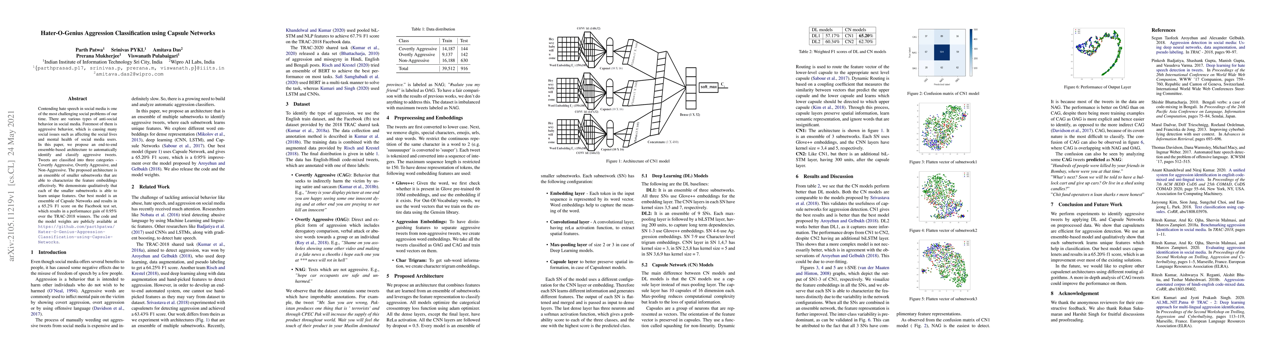 Contending hate speech in social media is one of the most challenging social problems of our time. There are various types of anti-social behavior in social media. Foremost of them is aggressive behavior, which is causing many social issues such as affecting the social lives and mental health of social media users. In this paper, we propose an end-to-end ensemble-based architecture to automatically identify and classify aggressive tweets. Tweets are classified into three categories - Covertly Aggressive, Overtly Aggressive, and Non-Aggressive. The proposed architecture is an ensemble of smaller subnetworks that are able to characterize the feature embeddings effectively. We demonstrate qualitatively that each of the smaller subnetworks is able to learn unique features. Our best model is an ensemble of Capsule Networks and results in a 65.2% F1 score on the Facebook test set, which results in a performance gain of 0.95% over the TRAC-2018 winners. The code and the model weights are publicly available at https://github.com/parthpatwa/Hater-O-Genius-Aggression-Classification-using-Capsule-Networks.