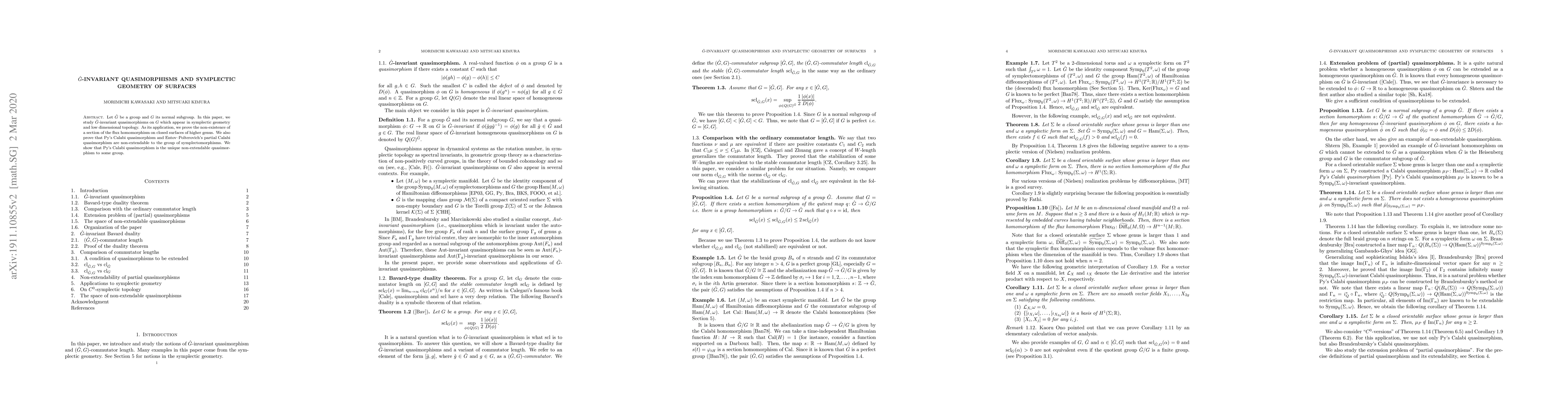 This paper investigates $\hat{G}$-invariant quasimorphisms on a normal subgroup $G$ in relation to symplectic geometry and low-dimensional topology, proving the non-existence of a section of the flux homomorphism on closed surfaces of higher genus. It also demonstrates that Py's and Entov-Polterovich's quasimorphisms are non-extendable to the group of symplectomorphisms, with Py's being the unique non-extendable quasimorphism to a certain group.