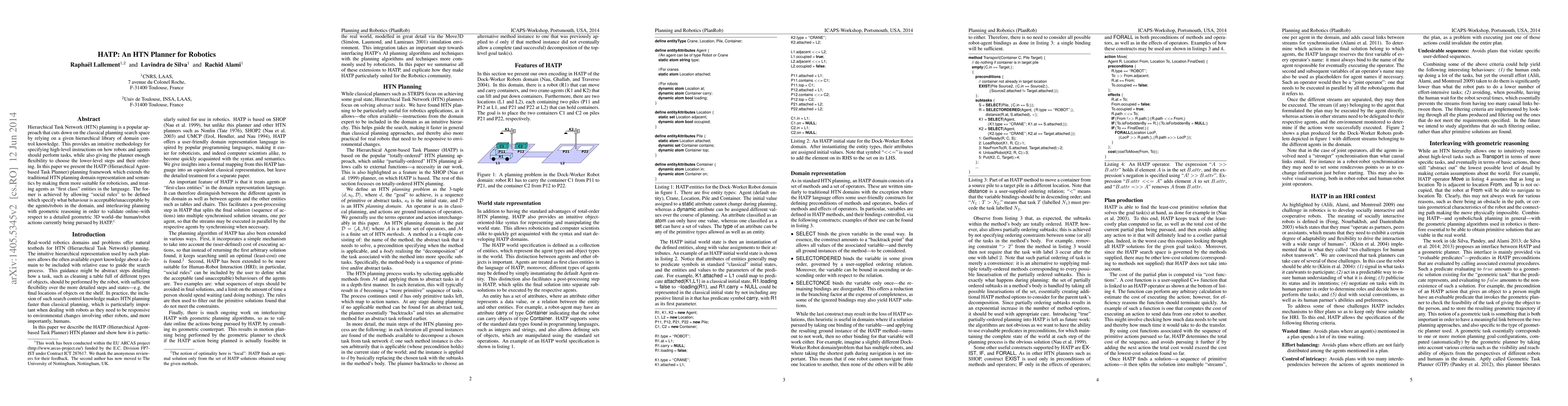 Hierarchical Task Network (HTN) planning is a popular approach that cuts down on the classical planning search space by relying on a given hierarchical library of domain control knowledge. This provides an intuitive methodology for specifying high-level instructions on how robots and agents should perform tasks, while also giving the planner enough flexibility to choose the lower-level steps and their ordering. In this paper we present the HATP (Hierarchical Agent-based Task Planner) planning framework which extends the traditional HTN planning domain representation and semantics by making them more suitable for roboticists, and treating agents as "first class" entities in the language. The former is achieved by allowing "social rules" to be defined which specify what behaviour is acceptable/unacceptable by the agents/robots in the domain, and interleaving planning with geometric reasoning in order to validate online -with respect to a detailed geometric 3D world- the human/robot actions currently being pursued by HATP.