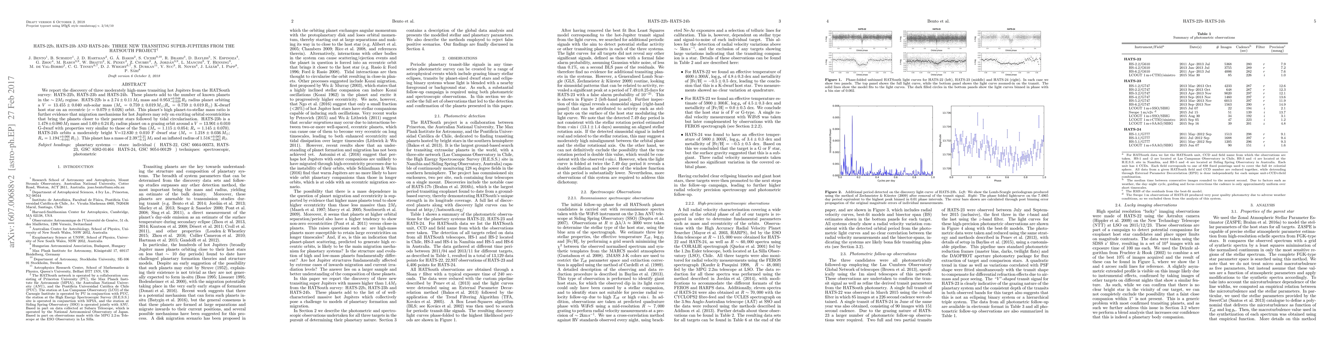 The HATSouth survey discovered three new transiting super-Jupiters: HATS-22b, HATS-23b, and HATS-24b, expanding the catalog of high-mass planets. These planets exhibit diverse characteristics, including eccentric orbits and varying host star types, supporting theories of hot Jupiter migration.