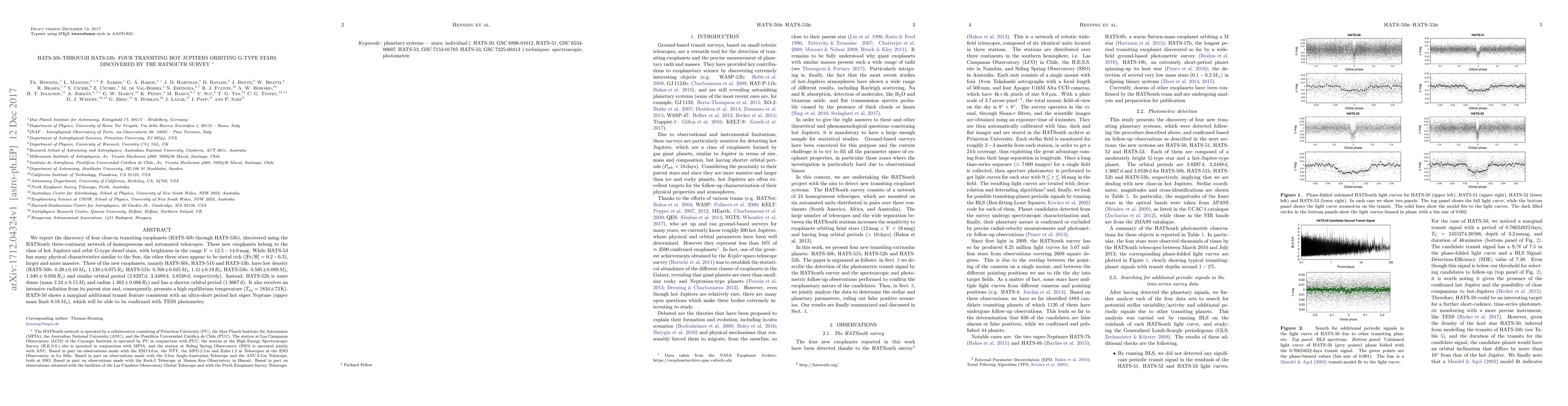 The HATSouth survey has identified four new transiting hot Jupiters, HATS-50 through HATS-53, orbiting G-type stars. HATS-52, in particular, is denser and has a shorter orbital period, while HATS-50 may host an ultra-short period hot super Neptune.