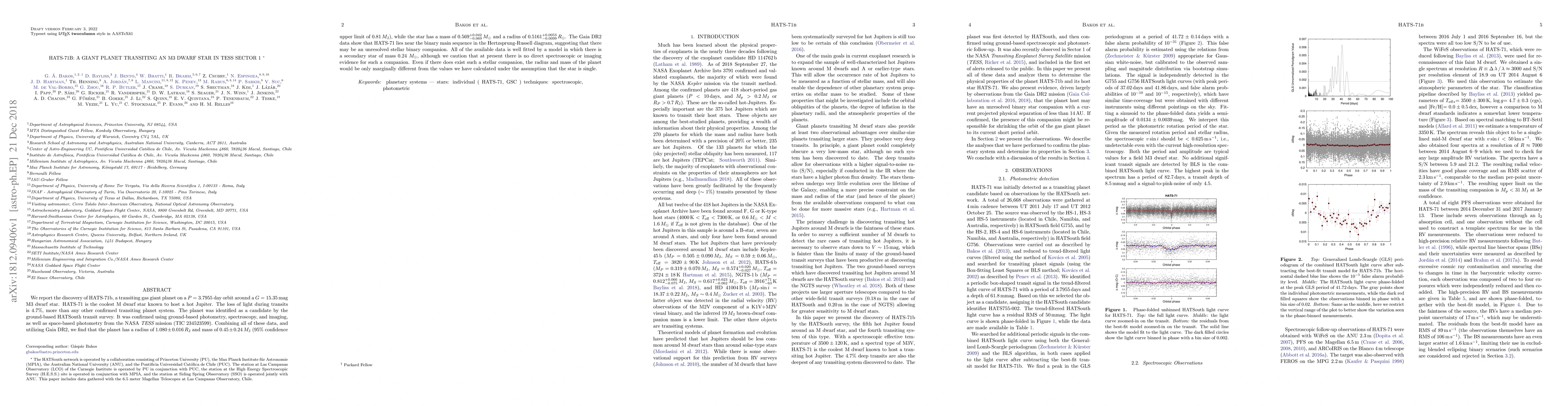 HATS-71b is a transiting gas giant planet orbiting a cool M3 dwarf star, discovered by the HATSouth survey and confirmed by TESS and ground-based observations. The planet has a radius of 1.08 RJ and a mass upper limit of 0.81 MJ, making it the hottest known Jupiter-like planet around an M3 star.