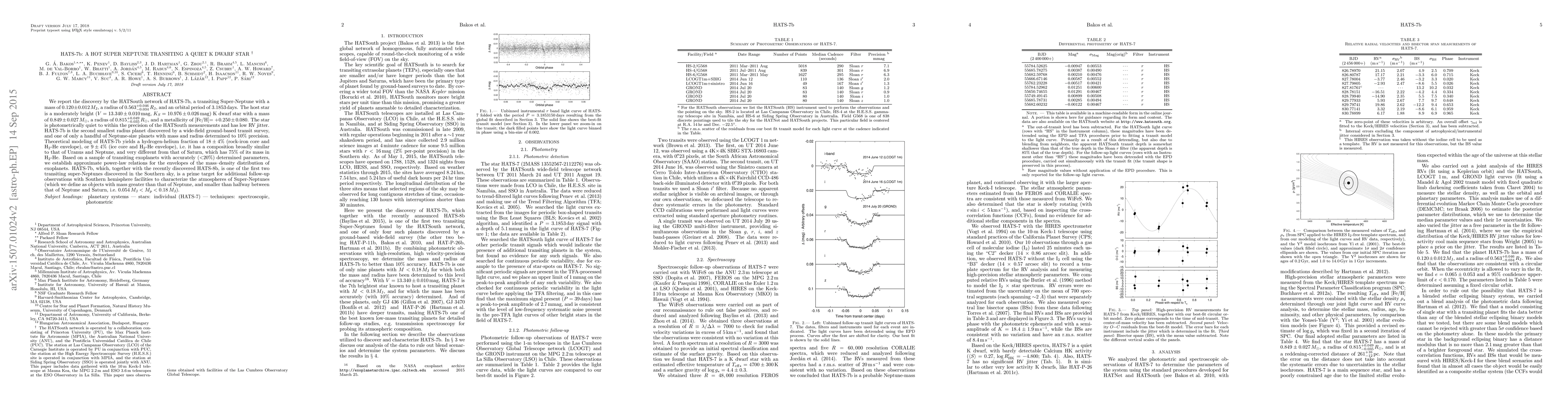 The HATSouth network discovered HATS-7b, a transiting Super-Neptune orbiting a quiet K dwarf star, with precise mass and radius measurements, making it a key candidate for atmospheric studies. Theoretical models suggest its composition is similar to Uranus and Neptune, differing from Saturn.
