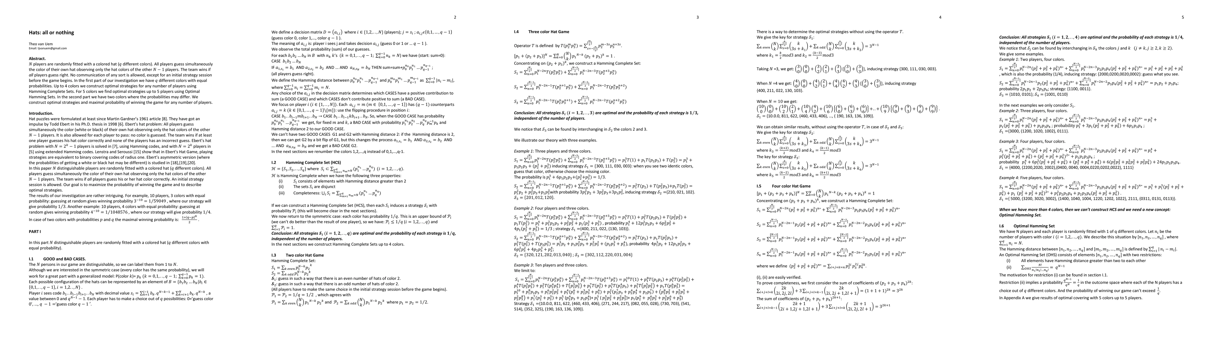 N players are randomly fitted with a colored hat (q different colors). All players guess simultaneously the color of their own hat observing only the hat colors of the other N-1 players. The team wins if all players guess right. No communication of any sort is allowed, except for an initial strategy session before the game begins. In the first part of our investigation we have q different colors with equal probability. Up to 4 colors we construct optimal strategies for any number of players using Hamming Complete Sets. For 5 colors we find optimal strategies up to 5 players using Optimal Hamming Sets. In the second part we have two colors where the probabilities may differ. We construct optimal strategies and maximal probability of winning the game for any number of players.