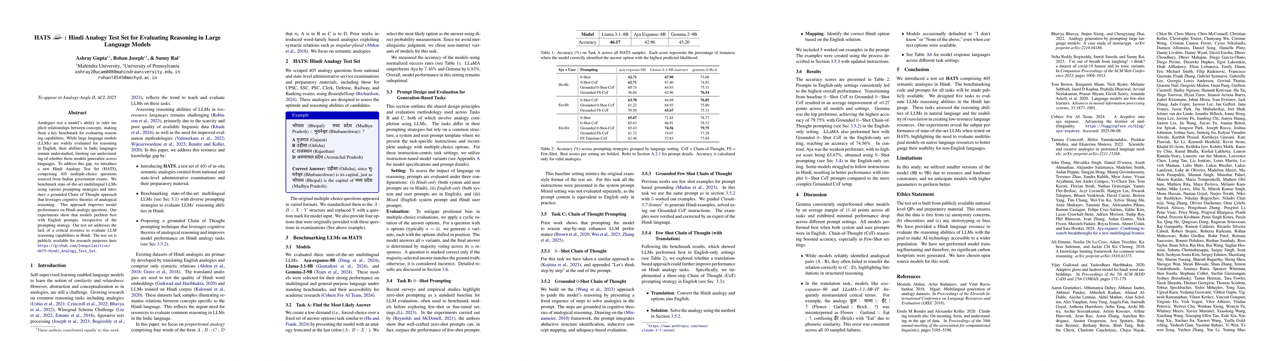 Analogies test a model's ability to infer implicit relationships between concepts, making them a key benchmark for evaluating reasoning capabilities. While large language models (LLMs) are widely evaluated for reasoning in English, their abilities in Indic languages remain understudied, limiting our understanding of whether these models generalize across languages. To address this gap, we introduce a new Hindi Analogy Test Set (HATS), comprising 405 multiple-choice questions sourced from Indian government exams. We benchmark state-of-the-art multilingual LLMs using various prompting strategies and introduce a grounded Chain of Thought approach that leverages cognitive theories of analogical reasoning. This approach improves model performance on Hindi analogy questions. Our experiments show that models perform best with English prompts, irrespective of the prompting strategy. Our test set addresses the lack of a critical resource to evaluate LLM reasoning capabilities in Hindi.