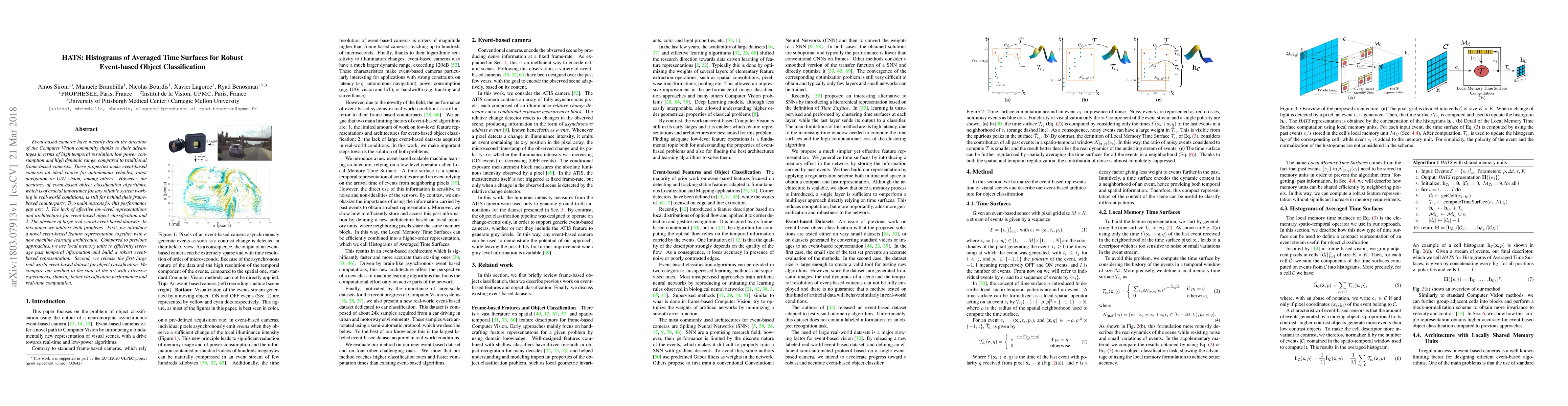 This paper introduces a novel event-based feature representation called Histograms of Averaged Time Surfaces (HATS) and a new machine learning architecture to improve object classification accuracy using event-based cameras. It also releases a large real-world event-based dataset to address the lack of such resources, demonstrating superior performance compared to state-of-the-art methods.