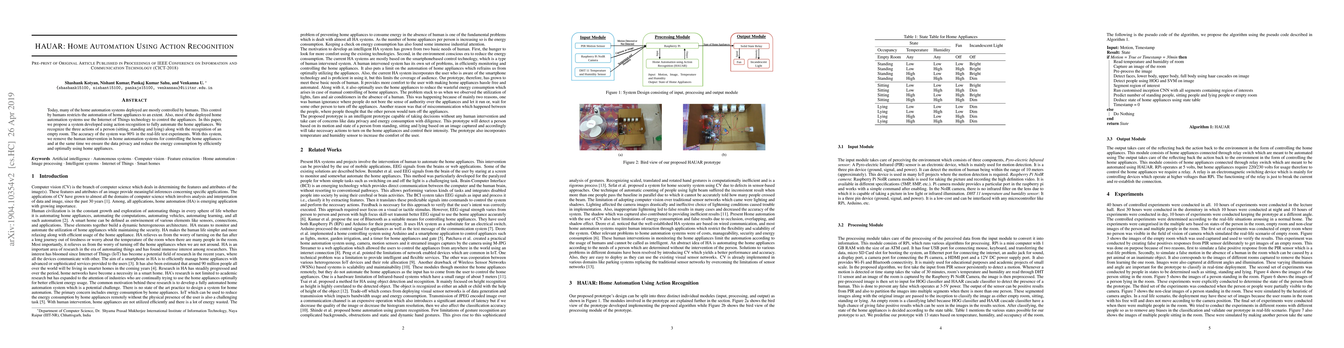 This paper proposes a home automation system using action recognition to automate home appliances without human intervention, achieving 90% accuracy in real-life tests. The system recognizes actions like sitting, standing, lying, and empty room detection, ensuring data privacy and reducing energy consumption.