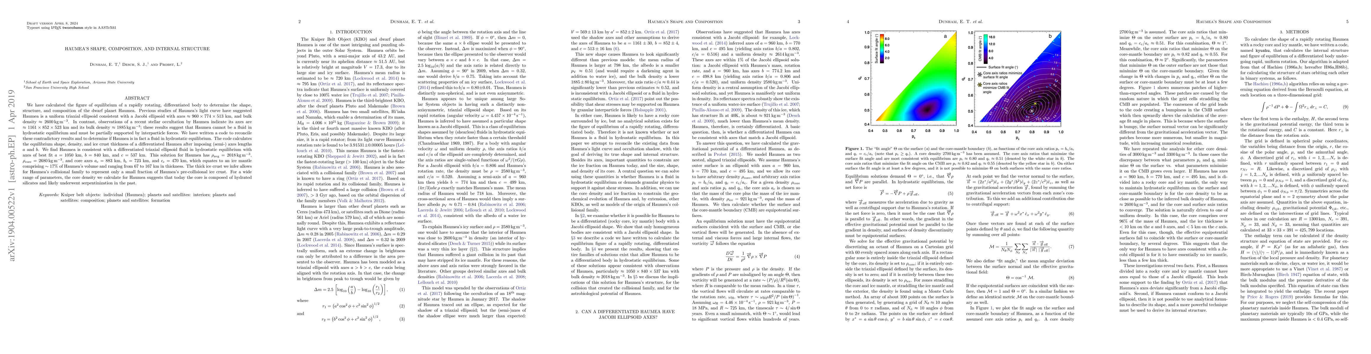 This study resolves discrepancies in Haumea's shape and composition, finding it is a differentiated triaxial ellipsoid in hydrostatic equilibrium with an ice crust and a core of hydrated silicates, rather than a uniform body. The calculated axes are 1050 km, 840 km, and 537 km, with an ice mantle thickness of 67 to 167 km.