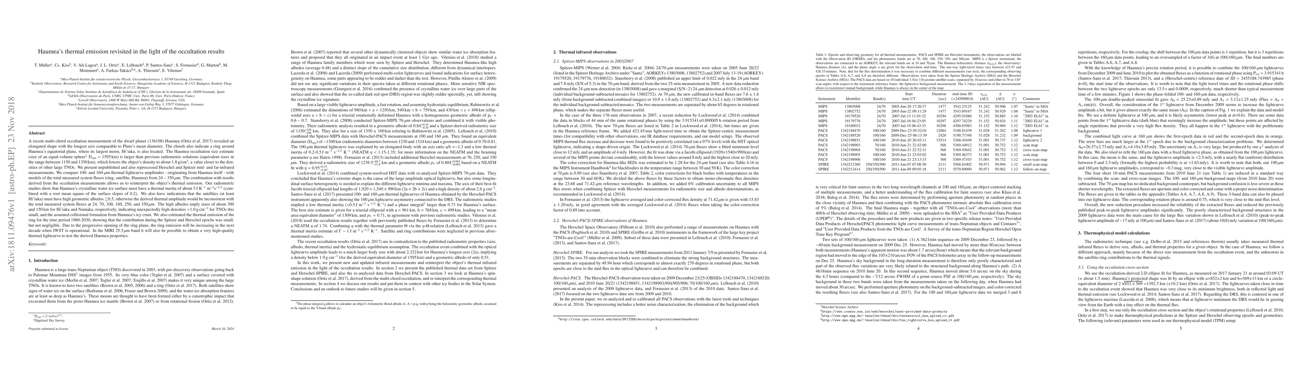 The occultation of Haumea revealed an elongated shape and a ring, leading to a revised size estimate of 1595 km and a lower density of 1.8 gcm-3. Thermal emission analysis indicates high thermal inertia and geometric albedos for its moons, suggesting unexpectedly high densities for these small Trans-Neptunian Objects.