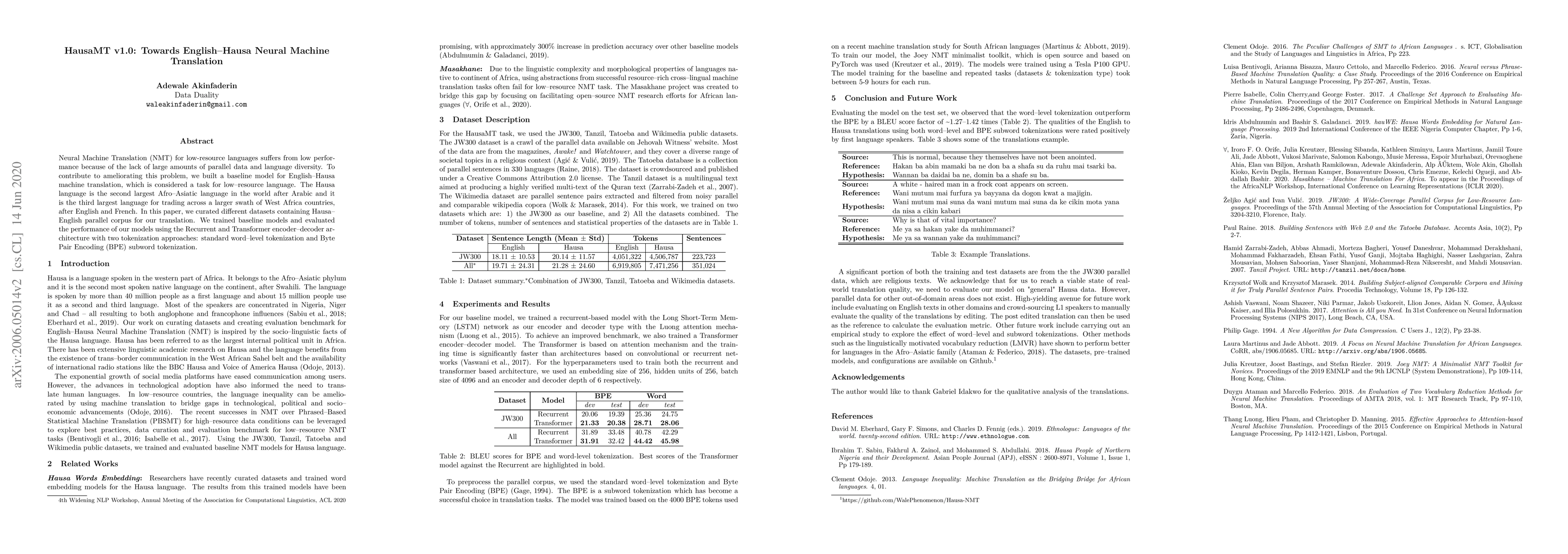 Neural Machine Translation (NMT) for low-resource languages suffers from low performance because of the lack of large amounts of parallel data and language diversity. To contribute to ameliorating this problem, we built a baseline model for English-Hausa machine translation, which is considered a task for low-resource language. The Hausa language is the second largest Afro-Asiatic language in the world after Arabic and it is the third largest language for trading across a larger swath of West Africa countries, after English and French. In this paper, we curated different datasets containing Hausa-English parallel corpus for our translation. We trained baseline models and evaluated the performance of our models using the Recurrent and Transformer encoder-decoder architecture with two tokenization approaches: standard word-level tokenization and Byte Pair Encoding (BPE) subword tokenization.