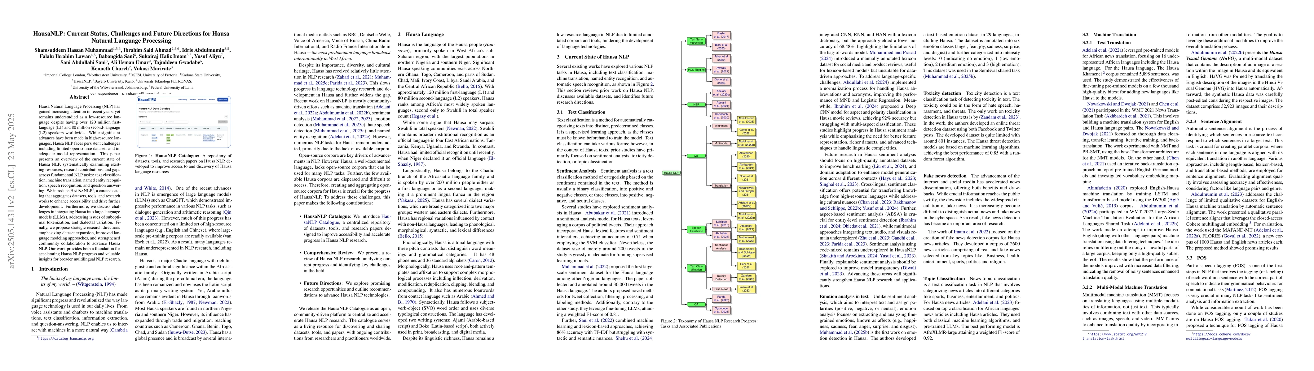 The paper presents a systematic examination of existing resources, research contributions, and gaps in Hausa NLP across fundamental NLP tasks.