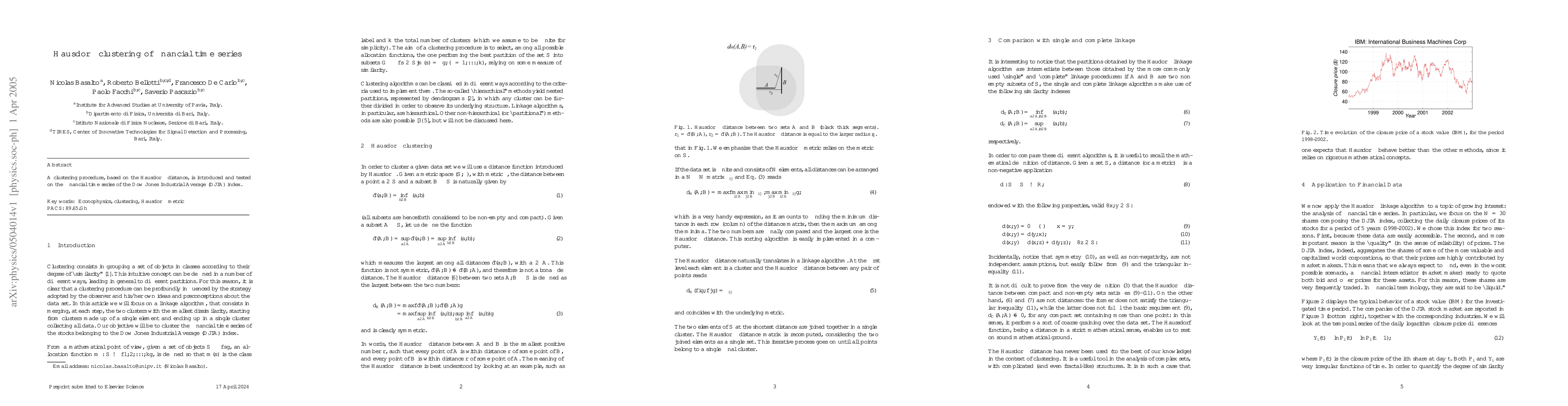 Summary: This paper proposes a clustering method using the Hausdorff distance to categorize financial time series data, specifically applying it to the Dow Jones Industrial Average (DJIA) index for analysis. The effectiveness of this approach is evaluated through empirical testing on the financial data.