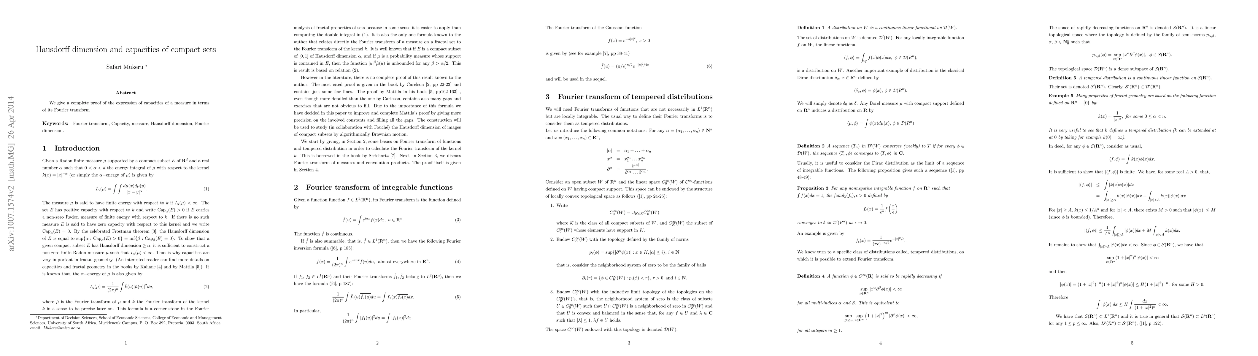 We give a complete proof of the expression of capacities of a measure in terms of its Fourier transform.