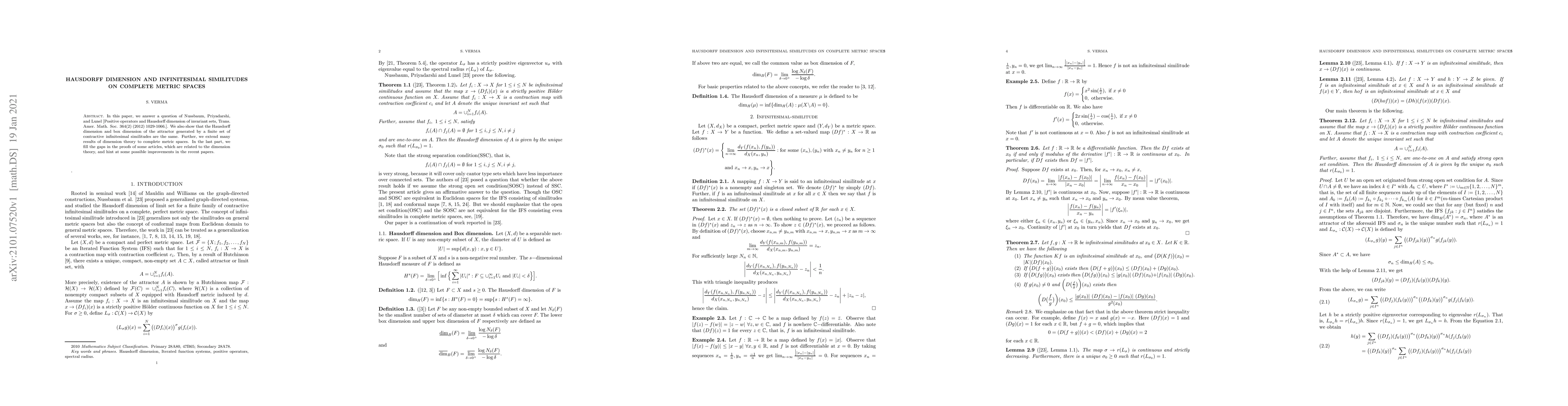 In this paper, we answer a question of Nussbaum, Priyadarshi, and Lunel [Positive operators and Hausdorff dimension of invariant sets, Trans. Amer. Math. Soc. 364(2) (2012) 1029-1066.]. We also show that the Hausdorff dimension and box dimension of the attractor generated by a finite set of contractive infinitesimal similitudes are the same. Further, we extend many results of dimension theory to complete metric spaces. In the last part, we fill the gaps in the proofs of some articles, which are related to the dimension theory, and hint at some possible improvements in the recent papers.