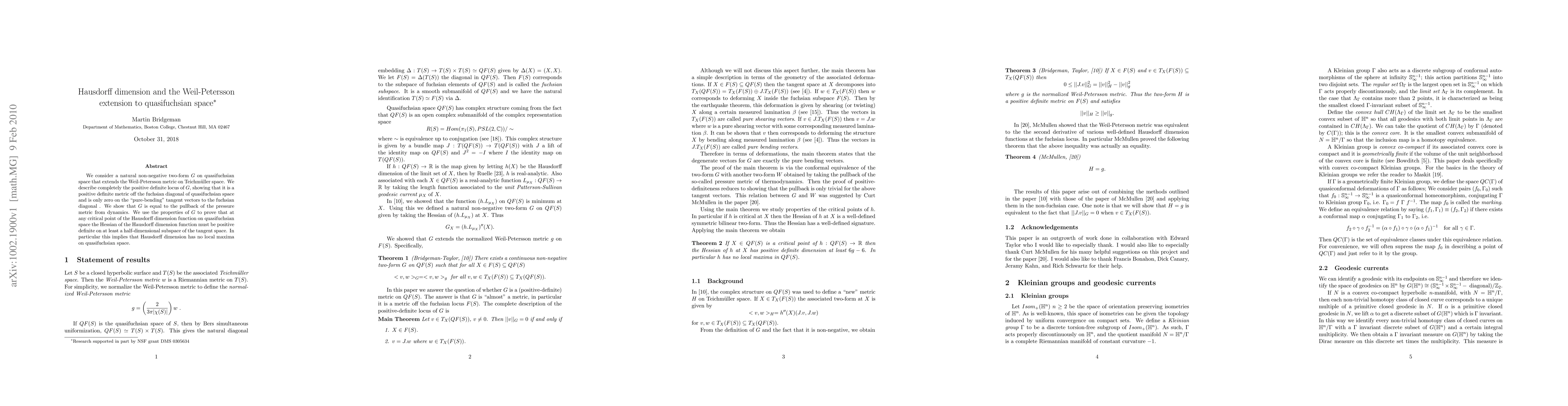 We consider a natural non-negative two-form G on quasifuchsian space that extends the Weil-Petersson metric on Teichmuller space. We describe completely the positive definite locus of G, showing that it is a positive definite metric off the fuchsian diagonal of quasifuchsian space and is only zero on the "pure-bending'' tangent vectors to the fuchsian diagonal . We show that G is equal to the pullback of the pressure metric from dynamics. We use the properties of G to prove that at any critical point of the Hausdorff dimension function on quasifuchsian space the Hessian of the Hausdorff dimension function must be positive definite on at least a half-dimensional subspace of the tangent space. In particular this implies that Hausdorff dimension has no local maxima on quasifuchsian space.