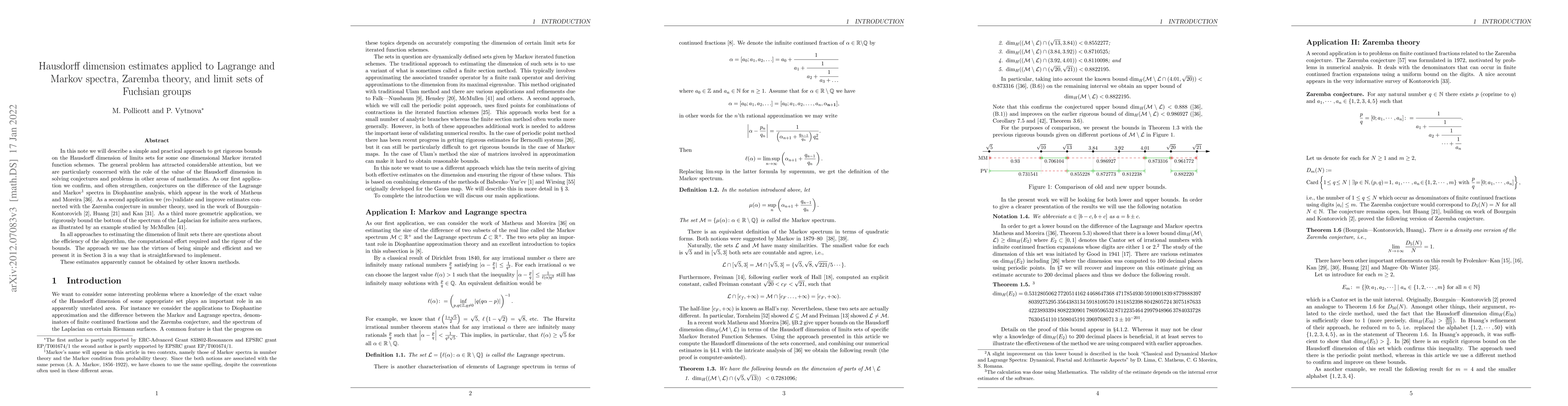 In this note we will describe a simple and practical approach to get rigorous bounds on the Hausdorff dimension of limits sets for some one dimensional Markov iterated function schemes. The general problem has attracted considerable attention, but we are particularly concerned with the role of the value of the Hausdorff dimension in solving conjectures and problems in other areas red of mathematics. As our first application we confirm, and often strengthen, conjectures on the difference of the Lagrange and Markov spectra in Diophantine analysis, which appear in the work of Matheus and Moreira arXiv:1803.01230. As a second application we (re-)validate and improve estimates connected with the Zaremba conjecture in number theory, used in the work of Bourgain-Kontorovich arXiv:1107.3776v2, Huang arXiv:1310.3772v4 and Kan arXiv:1604.04884. As a third more geometric application, we rigorously bound the bottom of the spectrum of the Laplacian for infinite area surfaces, as illustrated by an example studied by McMullen. In all approaches to estimating the dimension of limit sets there are questions about the efficiency of the algorithm, the computational effort required and the rigour of the bounds. The approach we use has the virtues of being simple and efficient and we present it in section 3 in a way that is straightforward to implement.