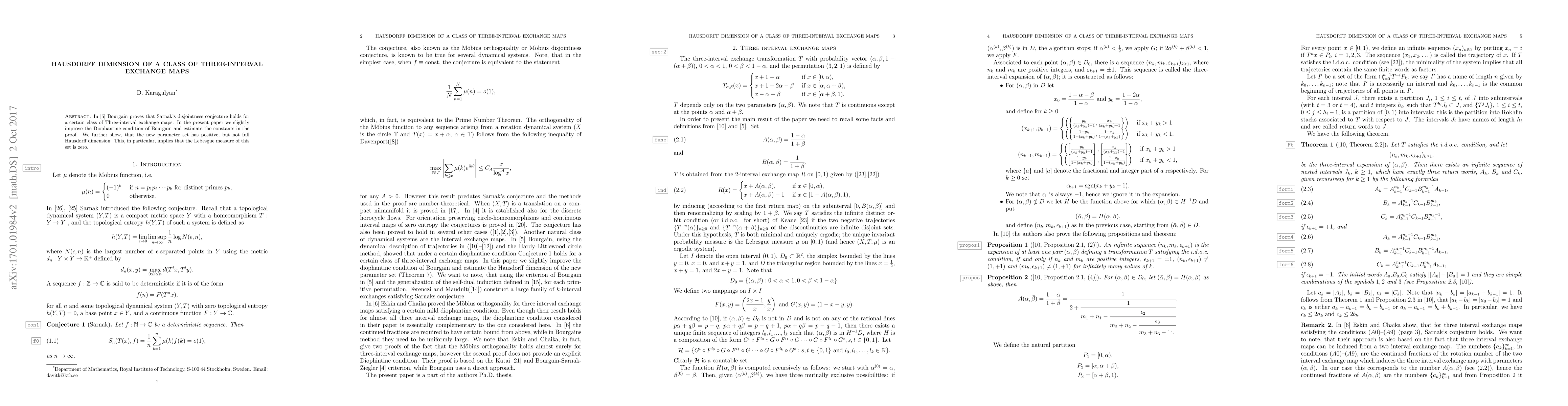 In \cite{B} Bourgain proves that Sarnak's disjointness conjecture holds for a certain class of Three-interval exchange maps. In the present paper we slightly improve the Diophantine condition of Bourgain and estimate the constants in the proof. We further show, that the new parameter set has positive, but not full Hausdorff dimension. This, in particular, implies that the Lebesgue measure of this set is zero.