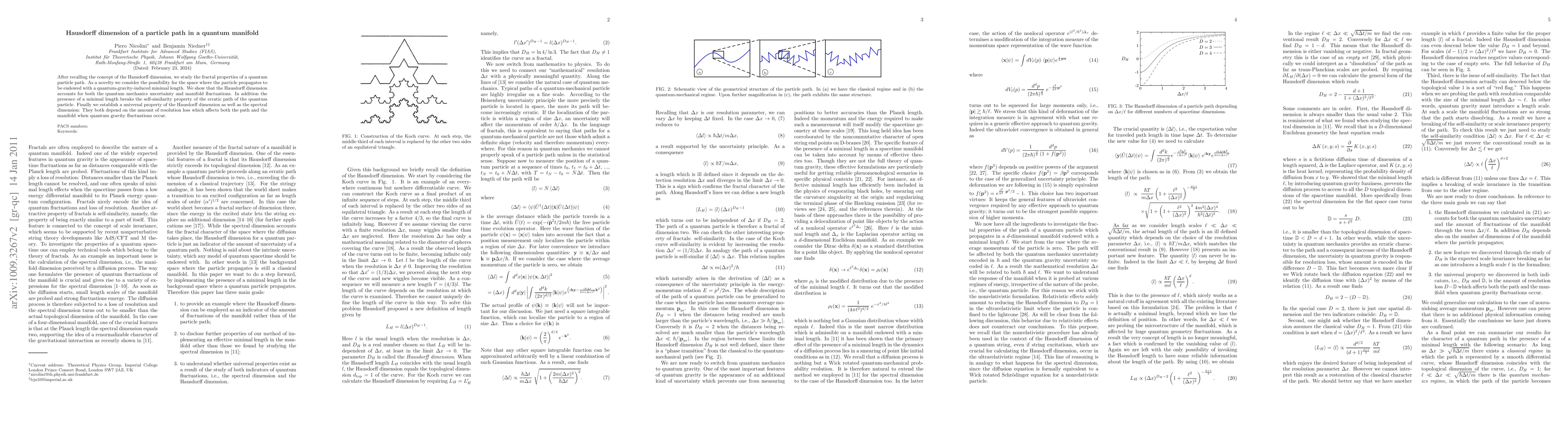 After recalling the concept of the Hausdorff dimension, we study the fractal properties of a quantum particle path. As a novelty we consider the possibility for the space where the particle propagates to be endowed with a quantum-gravity-induced minimal length. We show that the Hausdorff dimension accounts for both the quantum mechanics uncertainty and manifold fluctuations. In addition the presence of a minimal length breaks the self-similarity property of the erratic path of the quantum particle. Finally we establish a universal property of the Hausdorff dimension as well as the spectral dimension: They both depend on the amount of resolution loss which affects both the path and the manifold when quantum gravity fluctuations occur.