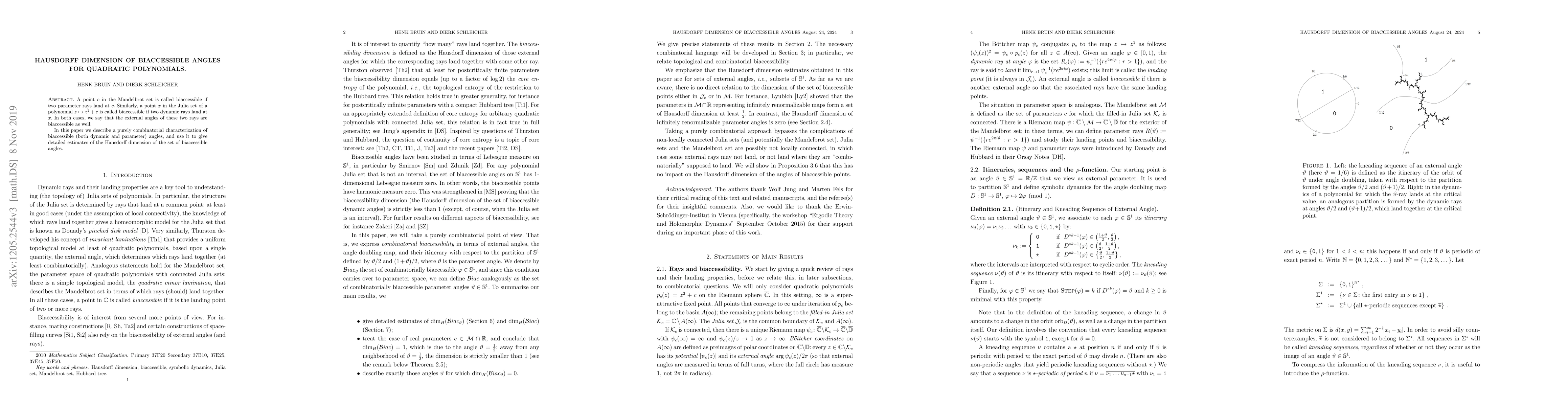 This paper investigates the Hausdorff dimension of biaccessible external angles for quadratic polynomials in the context of Julia and Mandelbrot sets. It provides bounds for this dimension and determines specific cases where the dimension equals 1 (when the Julia set is an interval) or 0 (at finite direct bifurcations from $z^2$ and their limit points).