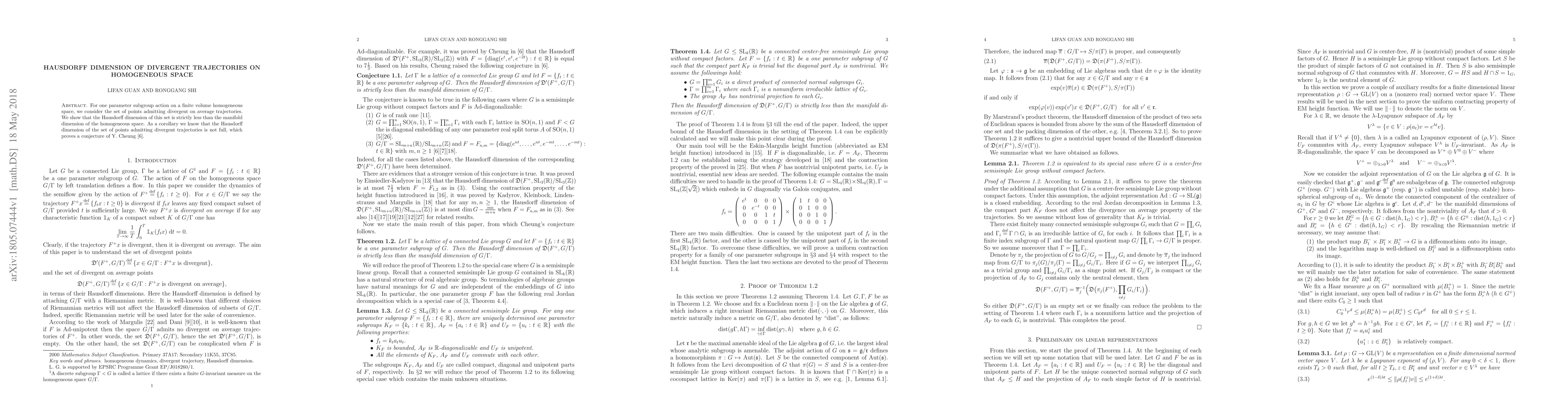 This paper investigates the Hausdorff dimension of divergent trajectories under one-parameter subgroup actions on finite volume homogeneous spaces, demonstrating that this dimension is strictly less than the manifold's dimension, thereby proving a conjecture by Y. Cheung.