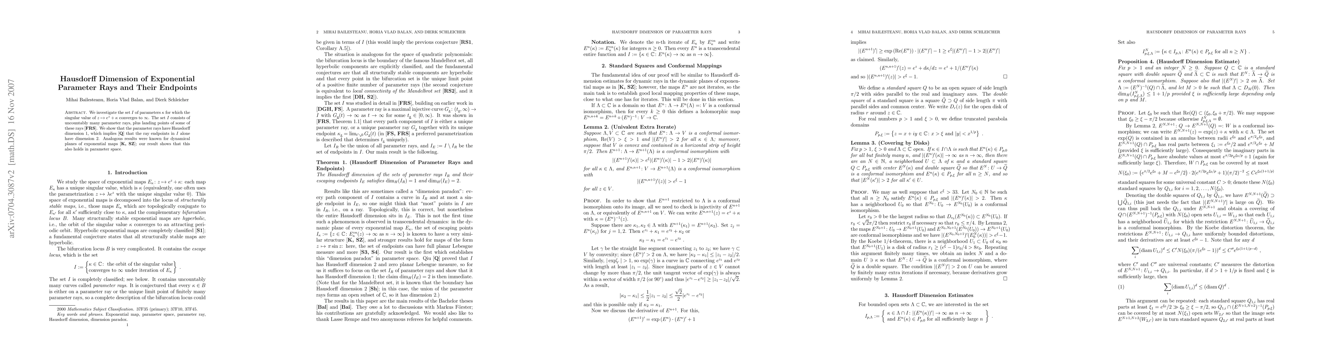 This paper examines the Hausdorff dimension of exponential parameter rays and their endpoints, demonstrating that the rays have a dimension of 1, while the endpoints possess a dimension of 2, extending known results from dynamical planes to parameter space.