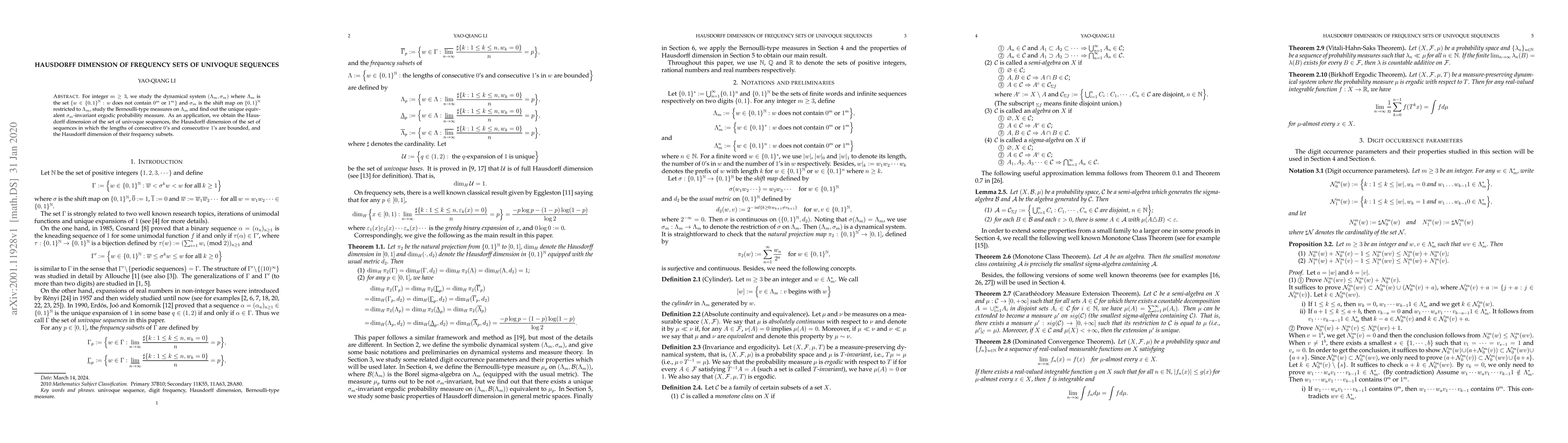 For integer $m\ge3$, we study the dynamical system $(\Lambda_m,\sigma_m)$ where $\Lambda_m$ is the set $\{w\in\{0,1\}^\mathbb{N}: w$ does not contain $0^m$ or $1^m\}$ and $\sigma_m$ is the shift map on $\{0,1\}^\mathbb{N}$ restricted to $\Lambda_m$, study the Bernoulli-type measures on $\Lambda_m$ and find out the unique equivalent $\sigma_m$-invariant ergodic probability measure. As an application, we obtain the Hausdorff dimension of the set of univoque sequences, the Hausdorff dimension of the set of sequences in which the lengths of consecutive $0$'s and consecutive $1$'s are bounded, and the Hausdorff dimension of their frequency subsets.