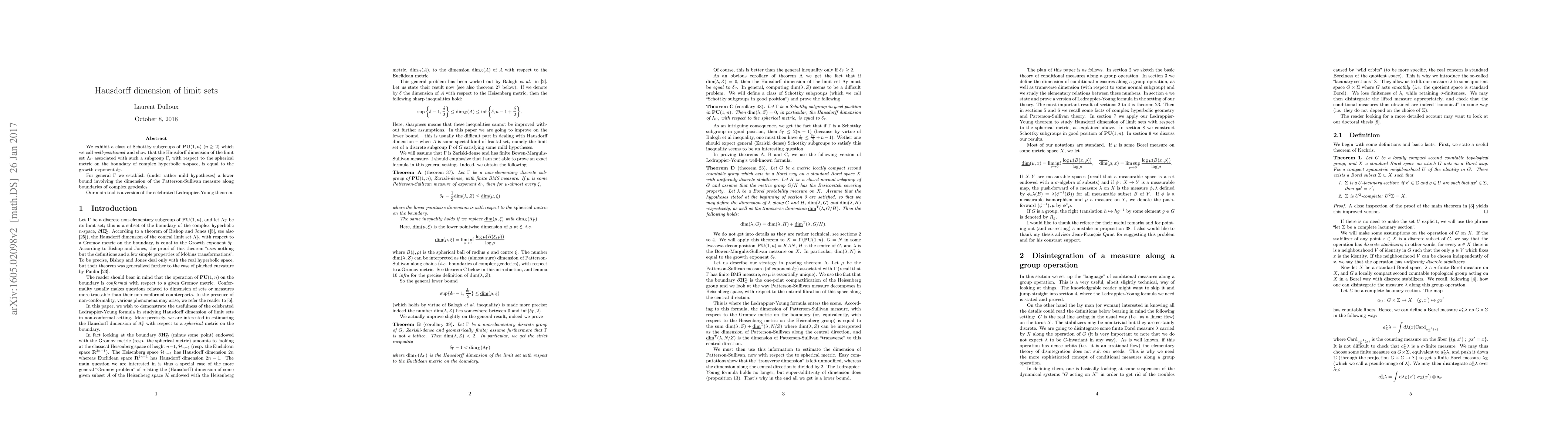 Researchers discovered a connection between the Hausdorff dimension of limit sets in complex hyperbolic n-space and the growth exponent of certain Schottky subgroups, providing insight into the behavior of these mathematical objects.