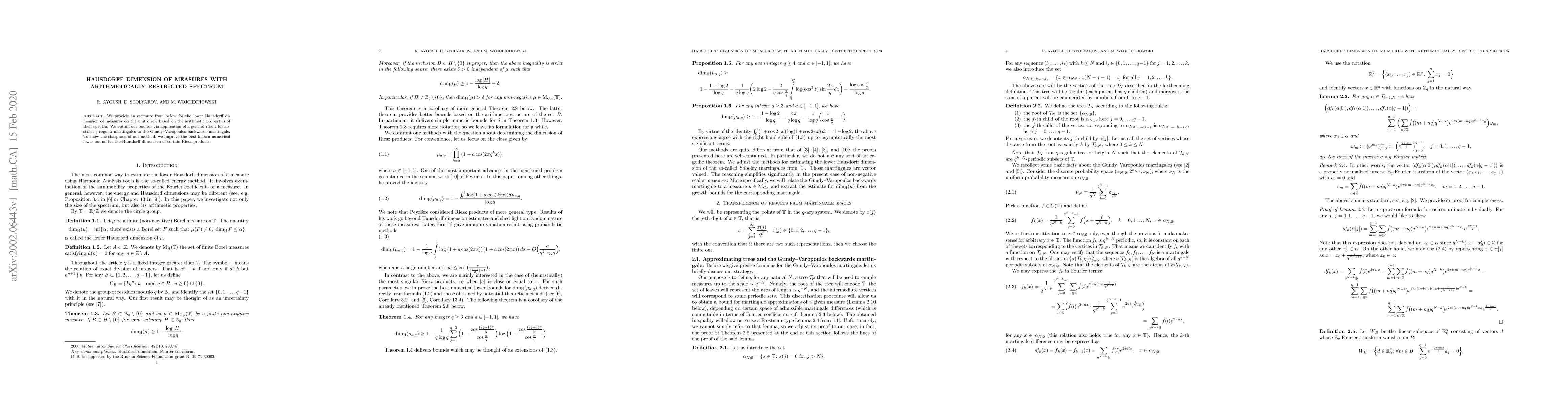 We provide an estimate from below for the lower Hausdorff dimension of measures on the unit circle based on the arithmetic properties of their spectra. We obtain our bounds via application of a general result for abstract $q$-regular martingales to the Gundy--Varopoulos backwards martingale. To show the sharpness of our method, we improve the best known numerical lower bound for the Hausdorff dimension of certain Riesz products.