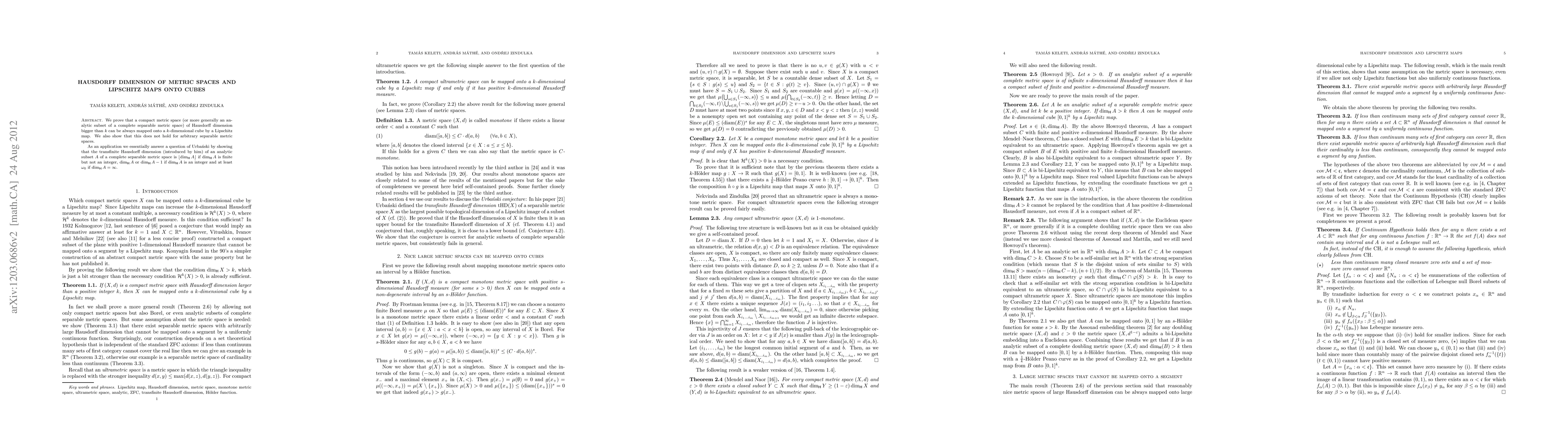 This paper proves that compact metric spaces with Hausdorff dimension greater than $k$ can be Lipschitz mapped onto $k$-dimensional cubes, while this does not apply to arbitrary separable metric spaces. It also resolves a question by showing the relationship between transfinite Hausdorff dimension and the integer part of the standard Hausdorff dimension for analytic subsets.