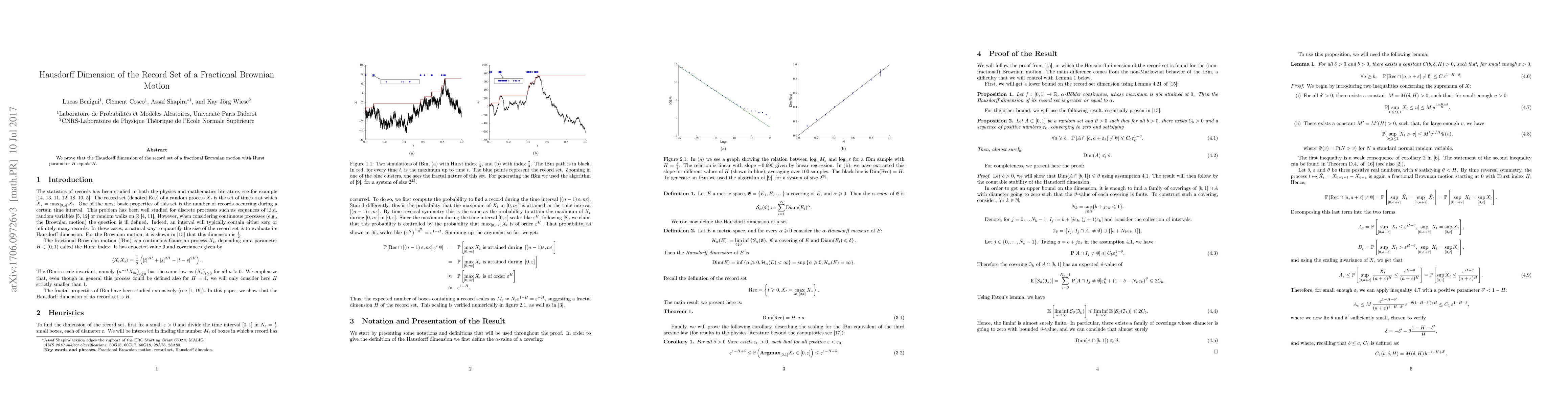 Summary: This paper establishes that the Hausdorff dimension of the record set for fractional Brownian motion is equal to the Hurst parameter $H$ of the motion. This result provides a precise measure of the complexity of the record set.
