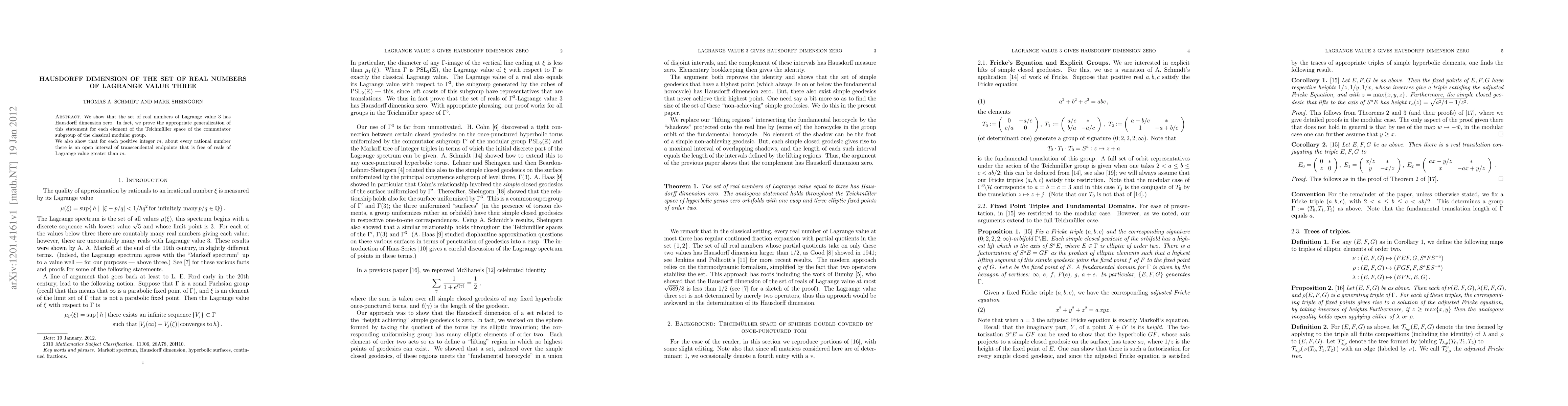 We show that the set of real numbers of Lagrange value 3 has Hausdorff dimension zero by showing the appropriate generalization for each element of the Teichmueller space of the appropriate subgroup of the classical modular group.