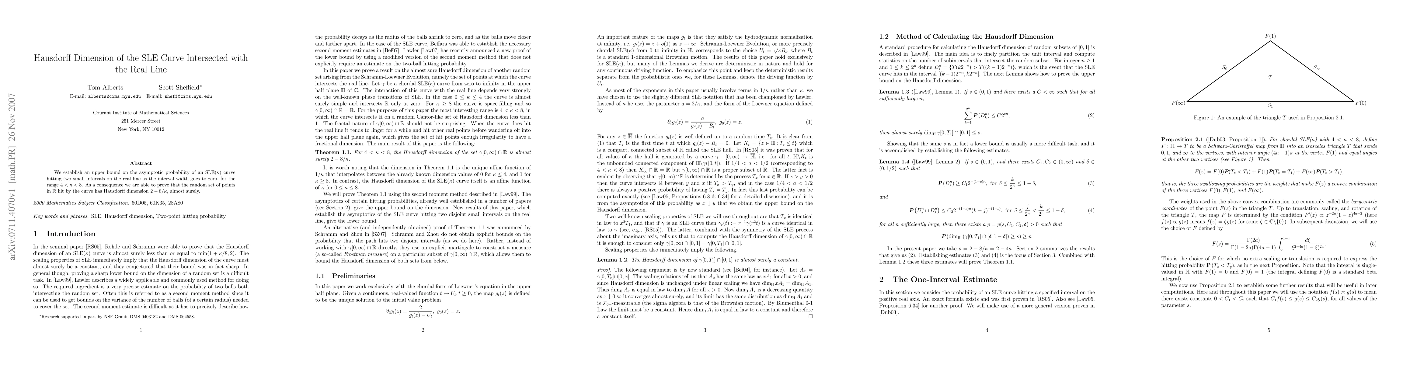 This paper proves an upper bound on the probability of an SLE(kappa) curve intersecting small intervals on the real line, leading to the conclusion that the intersection has a Hausdorff dimension of 2-8/kappa almost surely for 4 < kappa < 8.