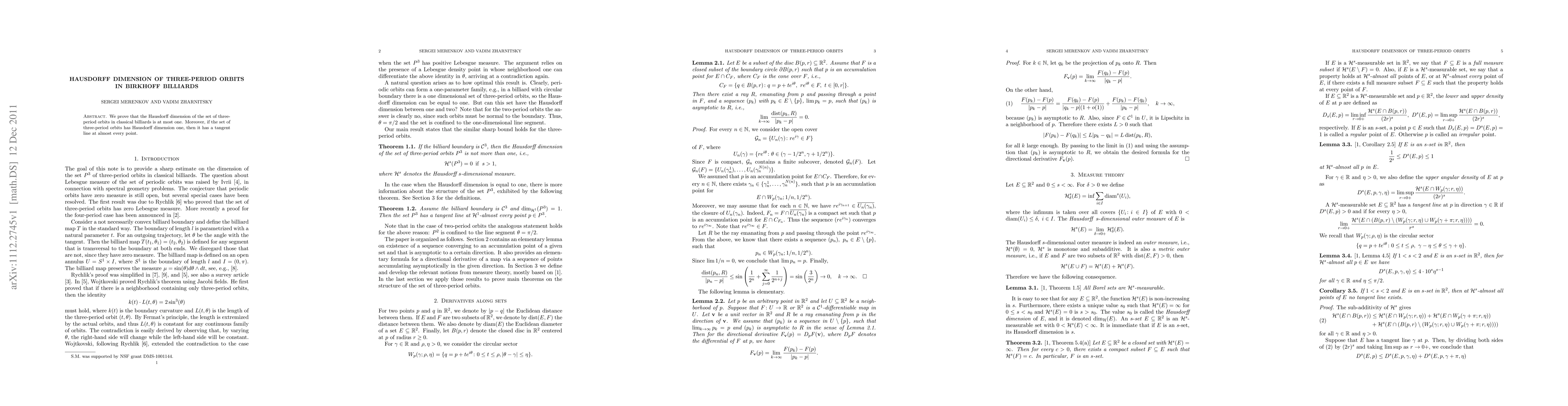 We prove that the Hausdorff dimension of the set of three-period orbits in classical billiards is at most one. Moreover, if the set of three-period orbits has Hausdorff dimension one, then it has a tangent line at almost every point.