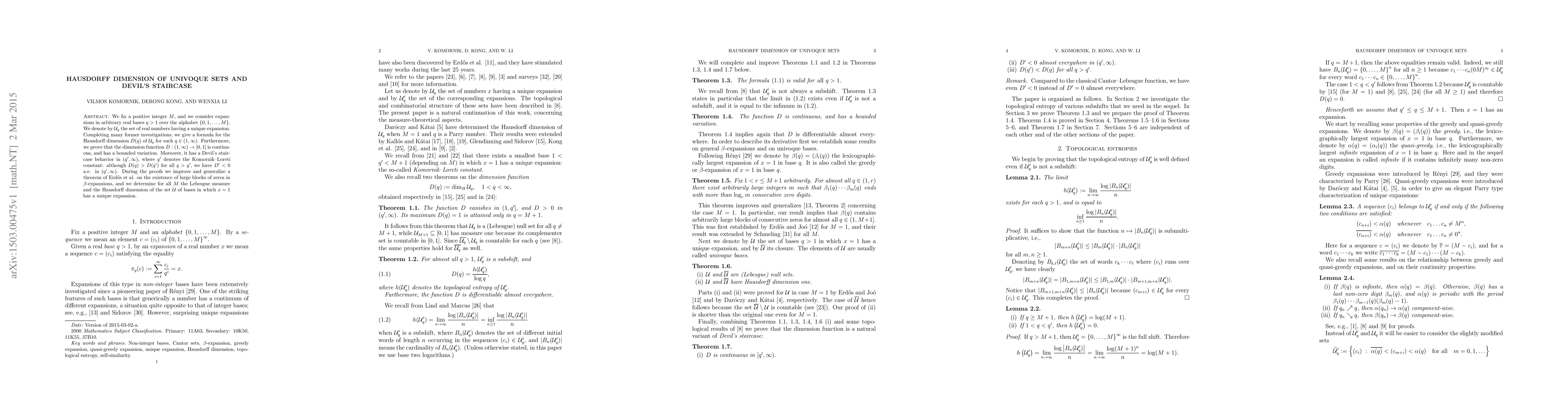 We fix a positive integer $M$, and we consider expansions in arbitrary real bases $q>1$ over the alphabet $\{0,1,...,M\}$. We denote by $U_q$ the set of real numbers having a unique expansion. Completing many former investigations, we give a formula for the Hausdorff dimension $D(q)$ of $U_q$ for each $q\in (1,\infty)$. Furthermore, we prove that the dimension function $D:(1,\infty)\to[0,1]$ is continuous, and has a bounded variation. Moreover, it has a Devil's staircase behavior in $(q',\infty)$, where $q'$ denotes the Komornik--Loreti constant: although $D(q)>D(q')$ for all $q>q'$, we have $D'<0$ a.e. in $(q',\infty)$. During the proofs we improve and generalize a theorem of Erd\H{o}s et al. on the existence of large blocks of zeros in $\beta$-expansions, and we determine for all $M$ the Lebesgue measure and the Hausdorff dimension of the set of bases in which $x=1$ has a unique expansion.