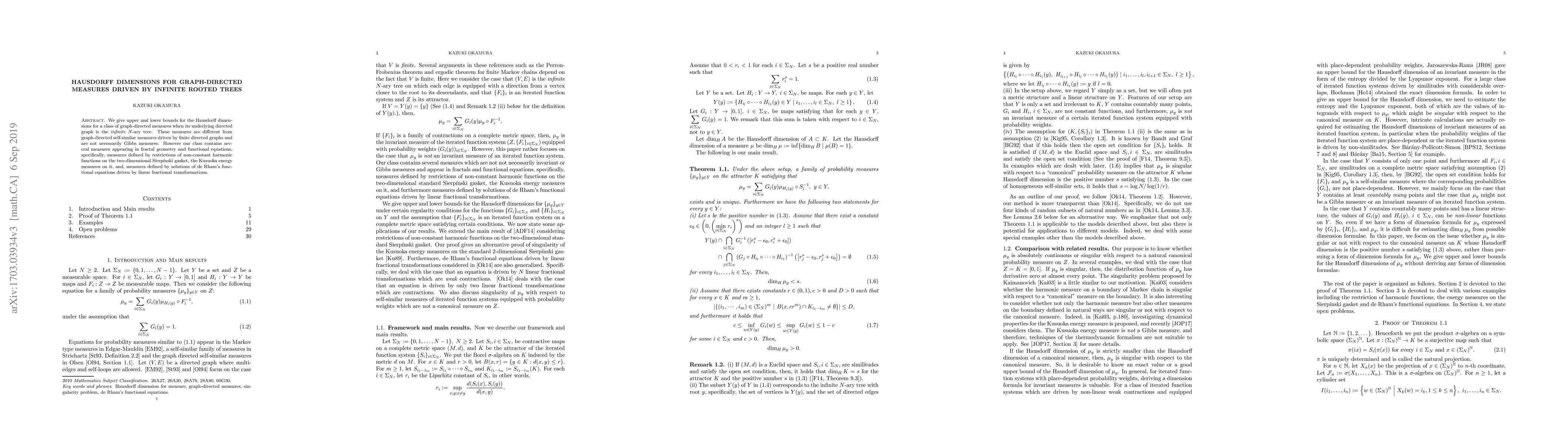 We give upper and lower bounds for the Hausdorff dimensions for a class of graph-directed measures when its underlying directed graph is the infinite N-ary tree. These measures are different from graph-directed self-similar measures driven by finite directed graphs and are not necessarily Gibbs measures. However our class contains several measures appearing in fractal geometry and functional equations, specifically, measures defined by restrictions of non-constant harmonic functions on the two-dimensional Sierp\'inski gasket, the Kusuoka energy measures on it, and, measures defined by solutions of de Rham's functional equations driven by linear fractional transformations.