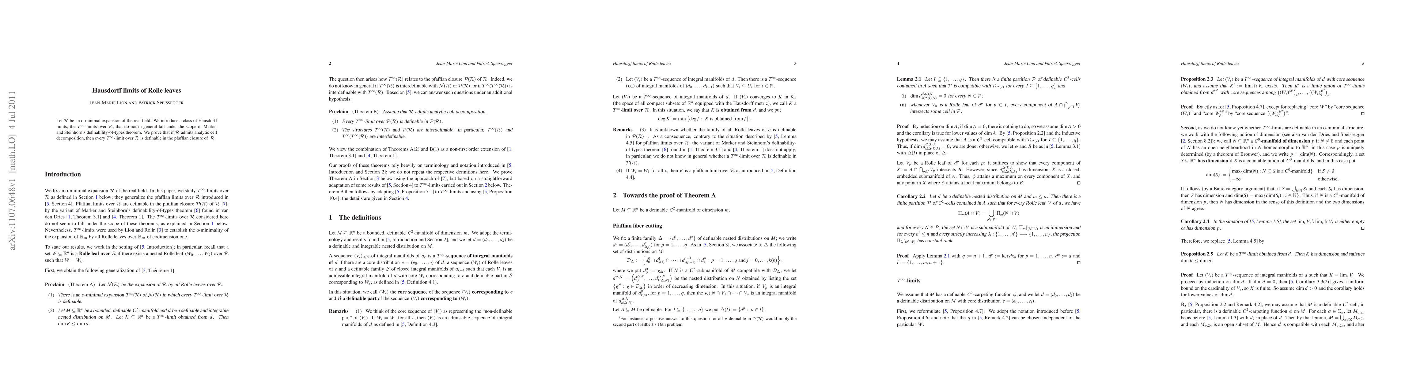 This paper introduces a new class of Hausdorff limits called T-infinity limits over o-minimal expansions of the real field, which can or cannot be defined using definability-of-types theorem. When an expansion has analytic cell decomposition, all its T-infinity limits are provably definable in the pfaffian closure.