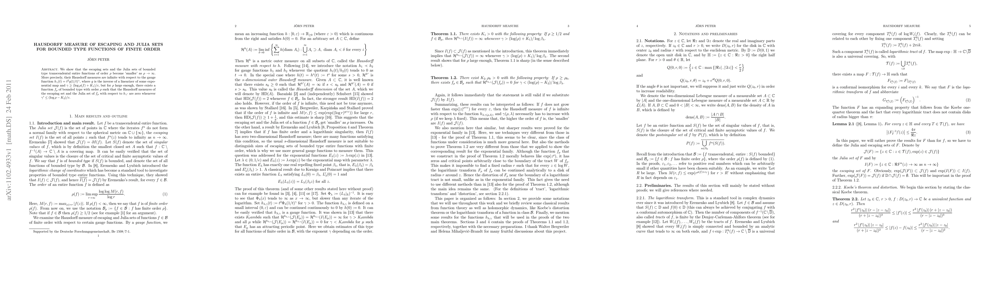 We show that the escaping sets and the Julia sets of bounded type transcendental entire functions of order $\rho$ become 'smaller' as $\rho\to\infty$. More precisely, their Hausdorff measures are infinite with respect to the gauge function $h_\gamma(t)=t^2g(1/t)^\gamma$, where $g$ is the inverse of a linearizer of some exponential map and $\gamma\geq(\log\rho(f)+K_1)/c$, but for $\rho$ large enough, there exists a function $f_\rho$ of bounded type with order $\rho$ such that the Hausdorff measures of the escaping set and the Julia set of $f_\rho$ with respect to $h_{\gamma'}$ are zero whenever $\gamma'\leq(\log\rho-K_2)/c$.