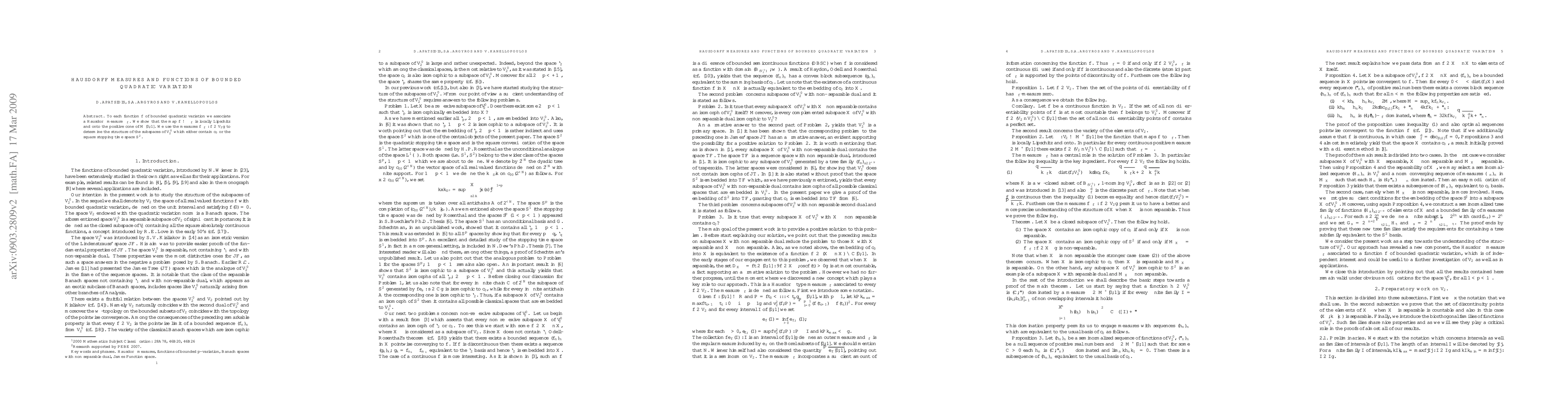 This paper associates a Hausdorff measure $\mu_f$ with each function $f$ of bounded quadratic variation, demonstrating that this mapping is locally Lipschitz and onto the positive cone of $\mathcal{M}[0,1]$. It uses these measures to analyze the structure of subspaces within $V_2^0$ containing $c_0$ or $S^2$.
